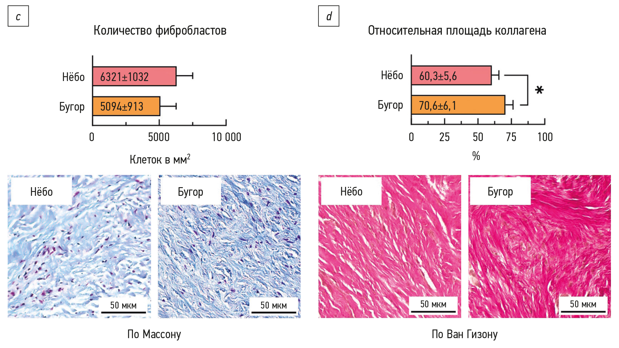 Fig. 2. Results of morphometry of connective tissue grafts from palatal and tuberosity gingiva: a, histogram of relative fat area in palatal and tuberosity gingival specimens and representative sections stained with hematoxylin and eosin; b, histogram of relative vascular area in palatal and tuberosity gingival specimens and representative sections stained with Masson’s stain; c, histogram of fibroblast count in palatal and tuberosity gingival specimens and representative sections stained with Masson’s stain; d, histogram of relative collagen area in palatal and tuberosity gingival specimens and representative sections stained with Van Gieson’s stain; * p < 0.05; *** p < 0.0001. “Нёбо” is a palate biopsy section. “Бугор” is a tuberosity biopsy section.