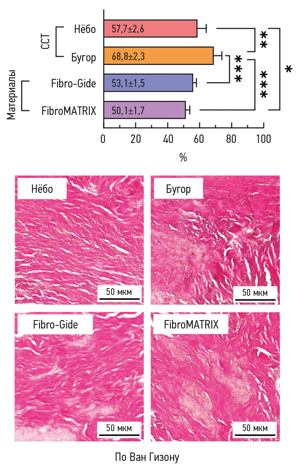 Fig. 3. Histogram of relative collagen area in regenerated gingival specimens obtained 3 months after surgery and representative Van Gieson stained sections; * p < 0.05; ** p < 0.01; *** p < 0.0001. “Нёбо” is a biopsy section after use of palatal free connective tissue graft; “Бугор” is a biopsy section after use of tuberosity palatal free connective tissue graft; “Fibro-Gide” is a Fibro-Gide collagen matrix biopsy section; “FibroMATRIX” i