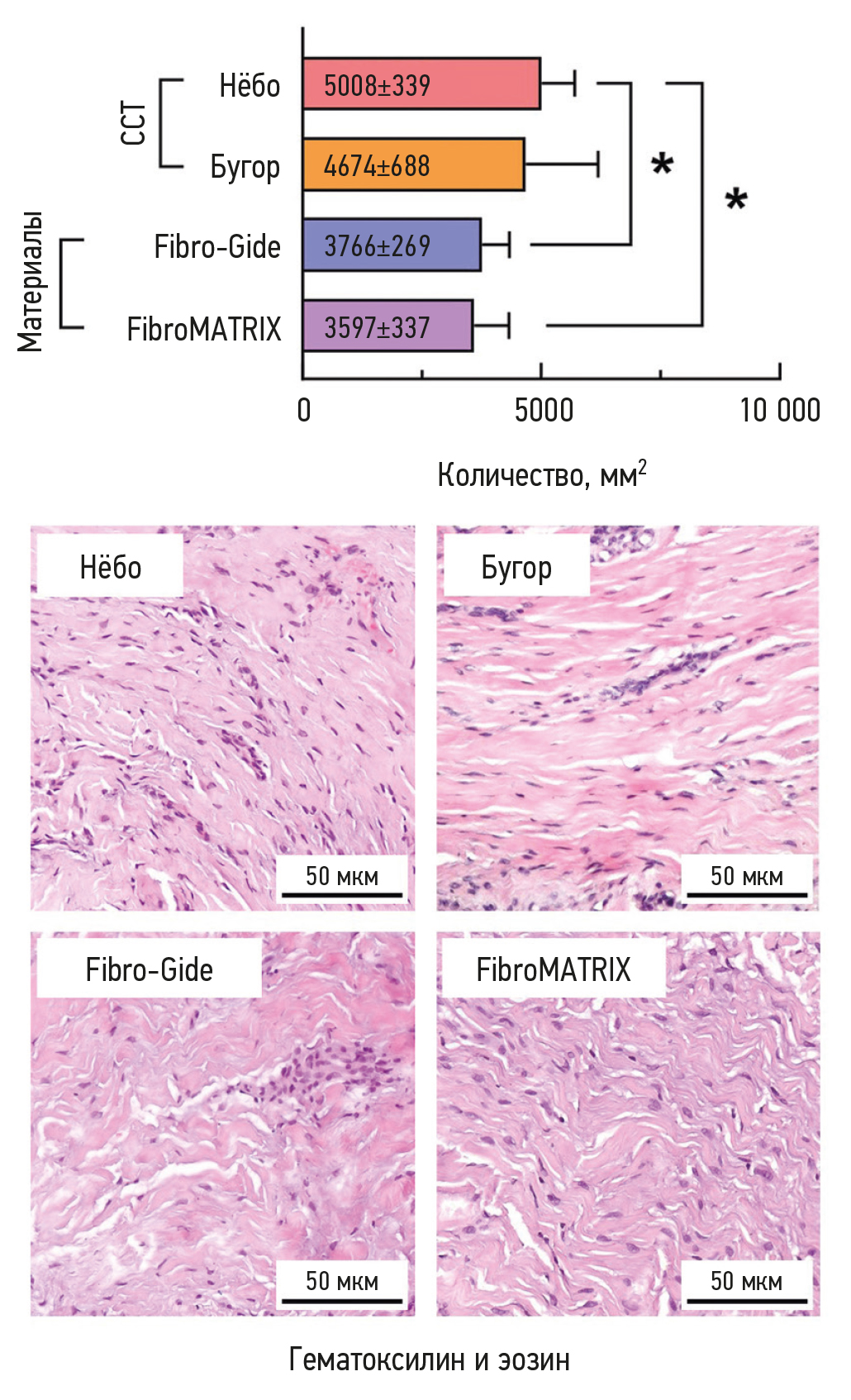 Fig. 5. Histogram of fibroblast counts per mm2 in specimens from the gingival regeneration area 3 months after surgery and representative hematoxylin and eosin stained sections; * p < 0.05. “Нёбо” is a biopsy section after use of palatal free connective tissue graft; “Бугор” is a biopsy section after use of tuberosity palatal free connective tissue graft; “Fibro-Gide” is a Fibro-Gide collagen matrix biopsy section; “FibroMATRIX” is a FibroMATRIX collagen matrix biopsy section.
