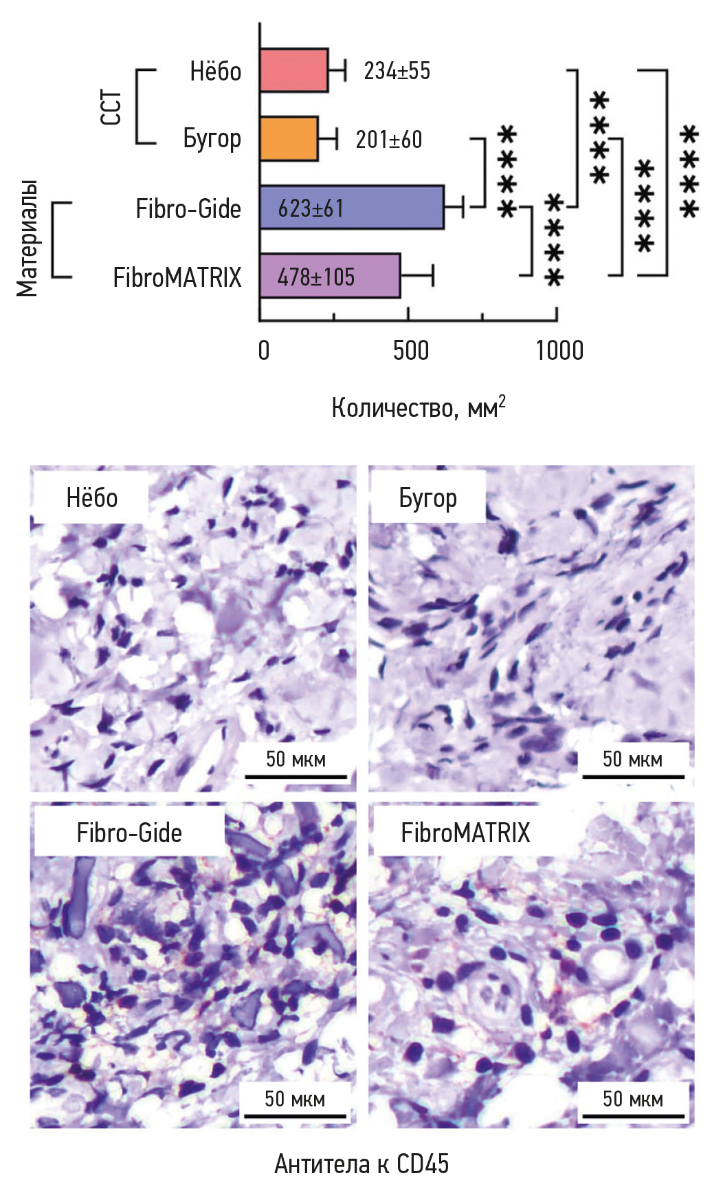 Fig. 7. Histogram of leucocyte and lymphocyte counts per mm2 in gingival regeneration specimens 3 months after surgery and representative immunohistochemically stained sections immunohistochemically stained with anti-CD45 antibodies; **** p < 0.00001. “Нёбо” is a biopsy section after use of palatal free connective tissue graft; “Бугор” is a biopsy section after use of tuberosity palatal free connective tissue graft; “Fibro-Gide” is a Fibro-Gide collagen matrix biopsy section; “FibroMATRIX” is a FibroMATRIX collagen matrix biopsy section.