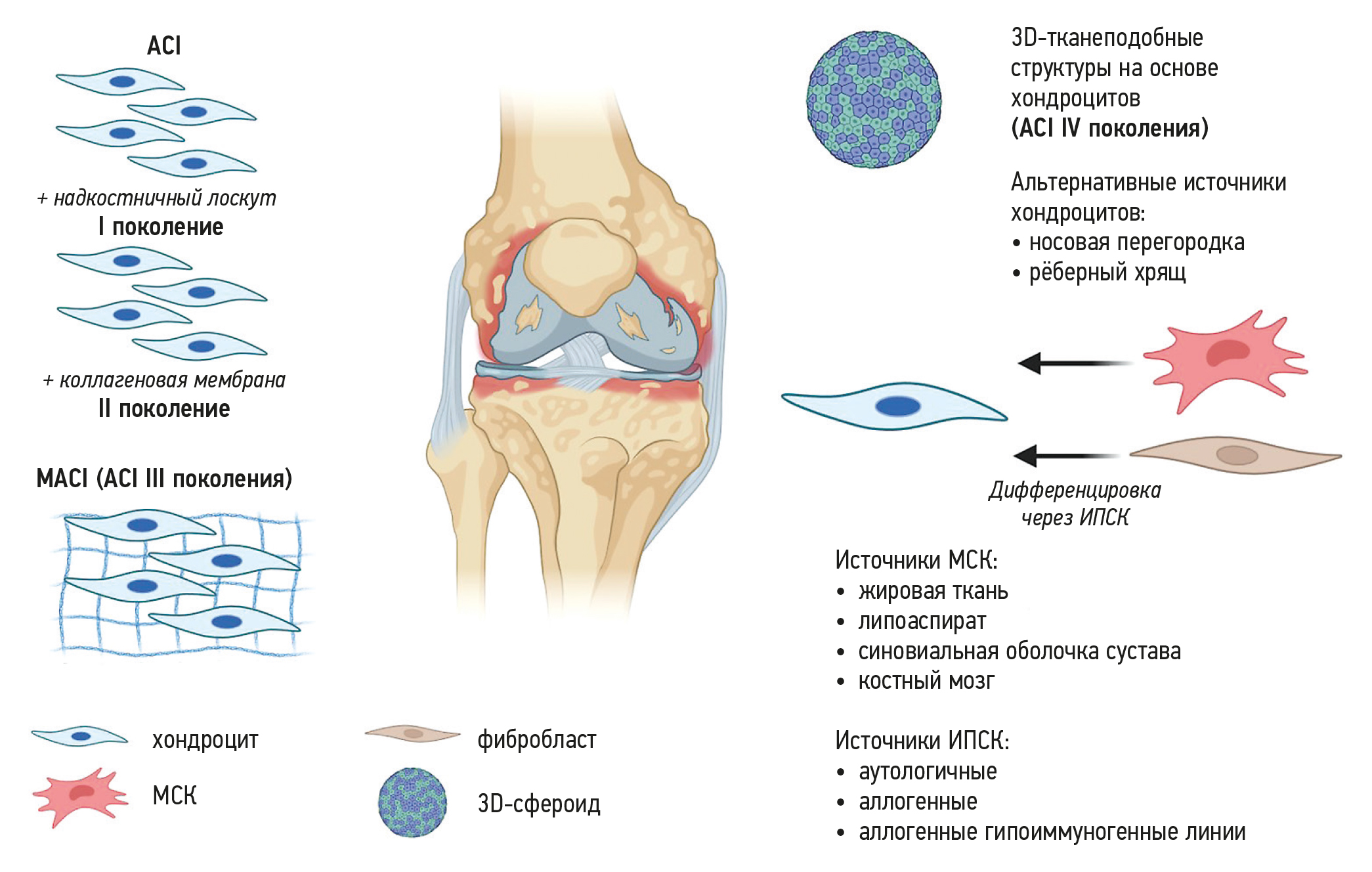 Одним из первых типов таких продуктов или подходов в терапии поражений суставов стала ACI. В данном случае артроскопически полученные биоптаты хряща используют в качестве материала для получения и наращивания клеток in vitro и изготовления на их основе клеточных препаратов для персонализированной терапии. В результате дальнейшего развития данного подхода появились следующие поколения ACI — матрикс-ассоциированная имплантация аутологичных хондроцитов (matrix-induced autologous chondrocyte implantation, MACI), а также имплантация препаратов тканевой инженерии (ПТИ) — 3D-тканеподобных структур на основе хондроцитов [4].