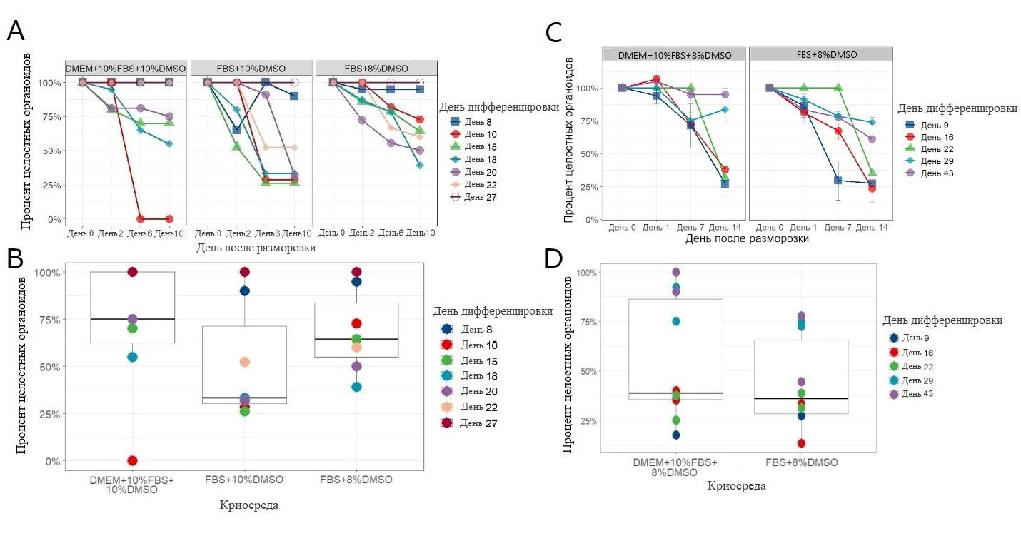 Оба способа криоконсервации могут использоваться для заморозки не только суспензий клеток, но и более сложных объектов, таких как фрагменты тканей и органоиды. Органоиды представляют собой трёхмерные многоклеточные структуры, являющиеся дифференцированными производными стволовых клеток или клеток-предшественников органов. Они используются для моделирования заболеваний, регенеративной медицины и тестирования различных терапевтических средств [8, 9]. В отличие от суспензий клеток органоиды имеют ряд дополнительных особенностей, которые следует учитывать при подборе протокола криоконсервации: организованные межклеточные взаимодействия, различная доступность клеток для компонентов раствора, отличия в криопротекторной и осмотической толерантности разных типов клеток в составе органоида [10]. Оптимизация условий криоконсервации и подбор универсального криопротекторного раствора позволят обеспечить длительное хранение органоидов и существенно упростят их использование в исследовательских или клинических целях.