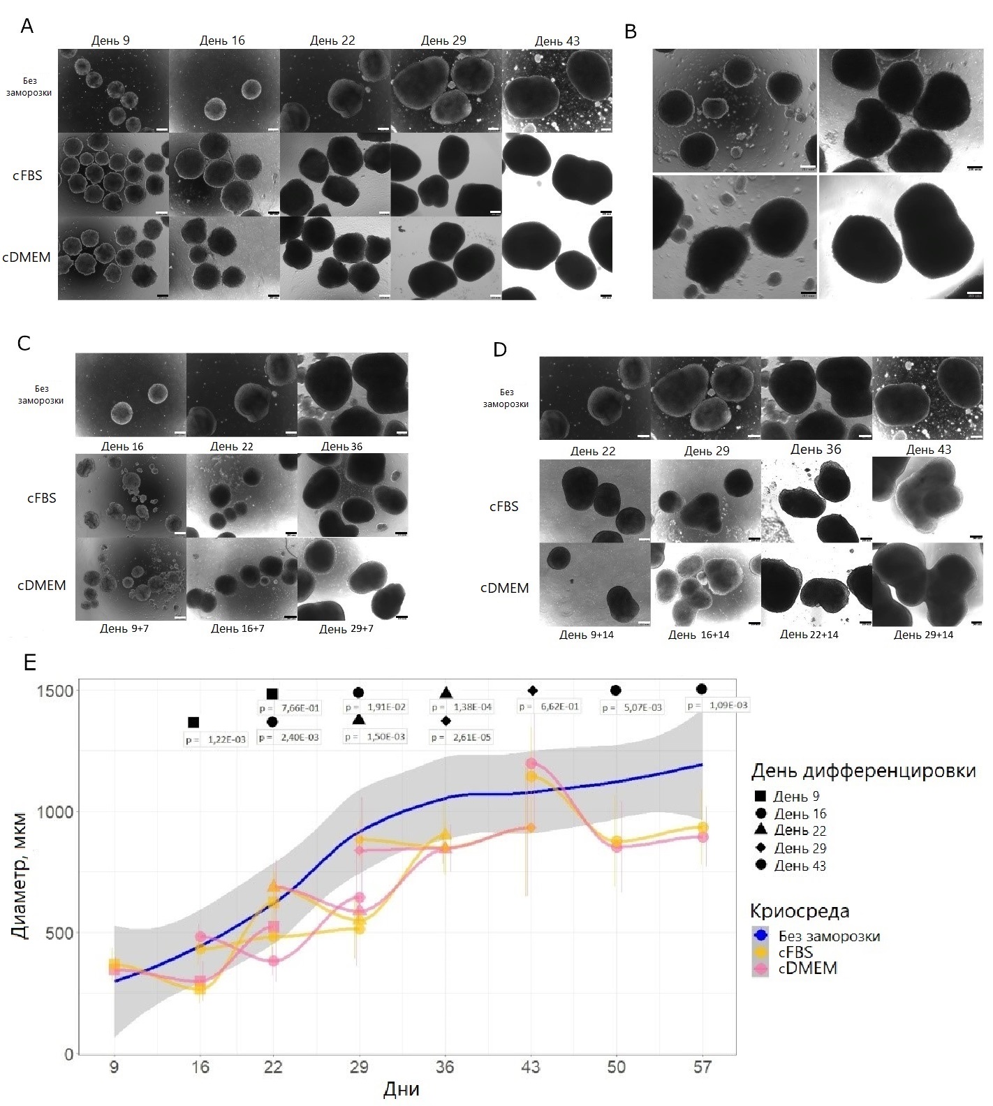 В день разморозки, на следующий день, через неделю и через 2 нед после разморозки органоиды фотографировали с помощью микроскопа Olimpus IX53 с камерой U-LS30-3 (Olimpus, Япония). Размер органоидов анализировали с использованием программного обеспечения ImageJ [40]. Интактные органоиды фотографировали в соответствующие криоконсервации дни. Эти фотографии использовали в качестве референса. Целостность органоидов и присутствие дебриса оценивали визуально с помощью световой микроскопии. Критериями целостных органоидов в нашем эксперименте были следующие: