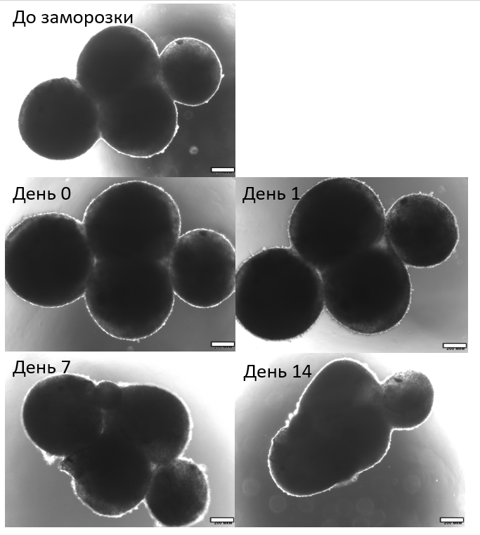 Для разморозки органоидов в качестве среды для отмывки от криопротектора использовали DMEM/F12 с 1% пеницилина-стремомицина («ПанЭко», Россия). Криовиалу после извлечения из жидкого азота нагревали в течение 2 мин при 37 °C. Затем пипеткой Пастера отбирали содержимое виалы, переносили в 4 мл среды DMEM/F12 комнатной температуры и плавно перемешивали. После осаждения органоидов под действием силы тяжести практически полностью отбирали надосадочную жидкость и ресуспендировали органоиды в среде для соответствующего типа клеток и стадии дифференцировки. Затем органоиды переносили в мини-биореакторы и оставляли в инкубаторе на орбитальном шейкере при 70 об./мин. Среду меняли 1 раз в 3–4 дня.