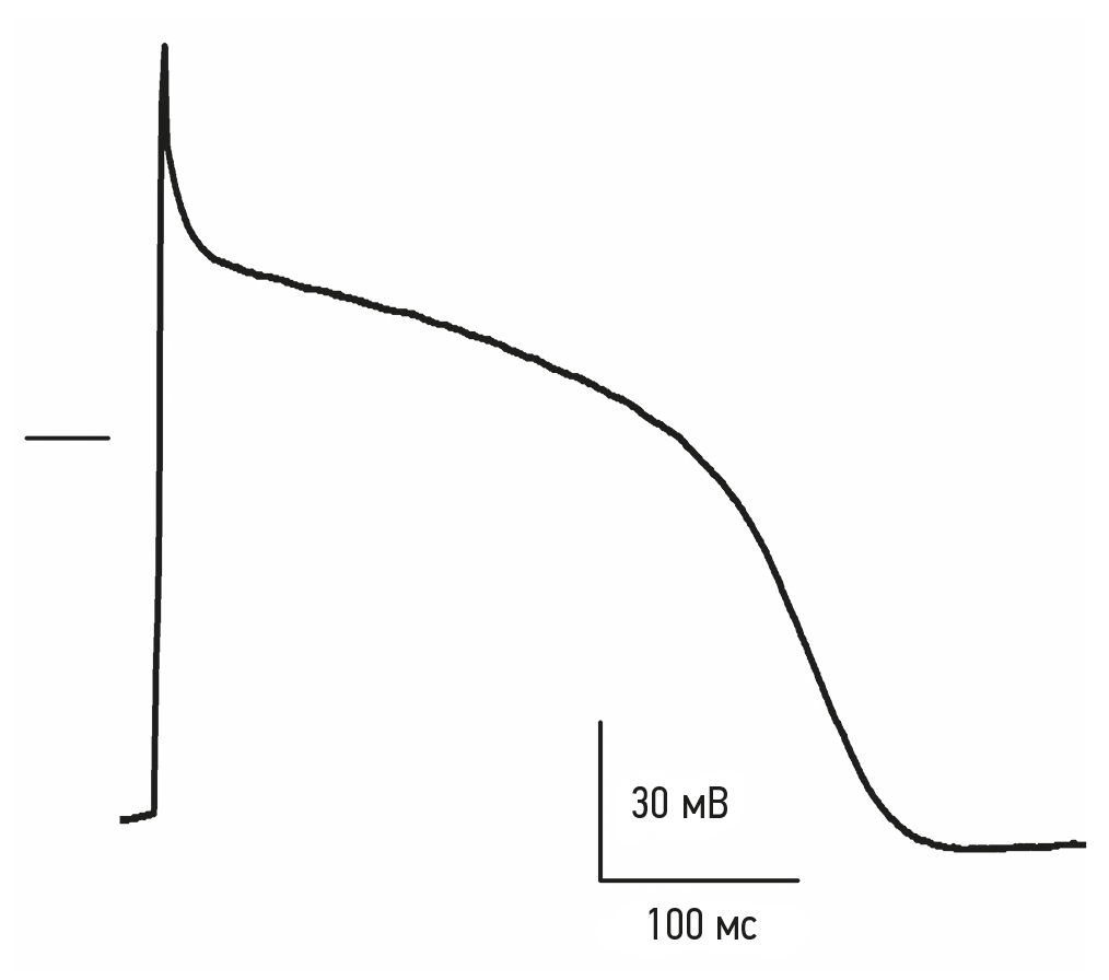 Рис. 1. Пример формы потенциала действия желудочковых кардиомиоцитов человека, дифференцированных из индуцированных плюрипотентных стволовых клеток линии здорового донора (уровень нулевого потенциала отмечен горизонтальной чертой).