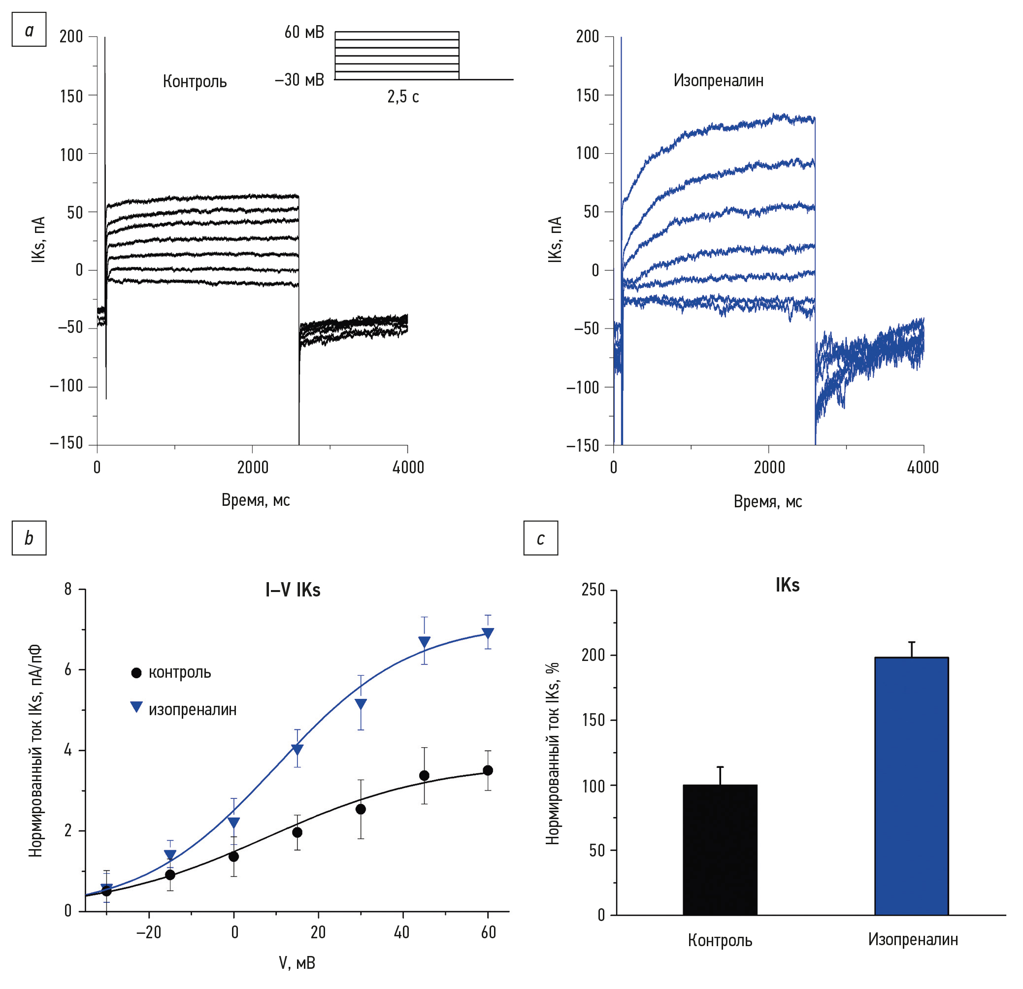 После добавления изопреналина каналы IKs увеличили амплитуду тока на 98%. В обычных условиях плотность медленной компоненты калиевых каналов IKs ниже, чем быстрого компонента IKr у людей и других крупных млекопитающих [26]. Однако известно, что стимуляция β-адренорецепторов увеличивает IKs, при этом практически не оказывает эффекта на IKr [27], и это противодействует увеличению ICa, L, в свою очередь предотвращая увеличение длины ПД. Действительно, физическая нагрузка и стресс являются типичными триггерами аритмии при врождённом синдроме удлинённого интервала QT 1-го типа, связанном с потерей функции IKs [28], и могут быть предотвращены блокадой β-адренорецепторов [29]. С помощью компьютерного моделирования было показано, что увеличение отношения IKs/IKr без изменения длины ПД ограничивает возникновение ранних постдеполяризаций. Возможно, IKs более эффективны в стабилизации длительности ПД и подавлении ранних постдеполяризаций, чем IKr [30].