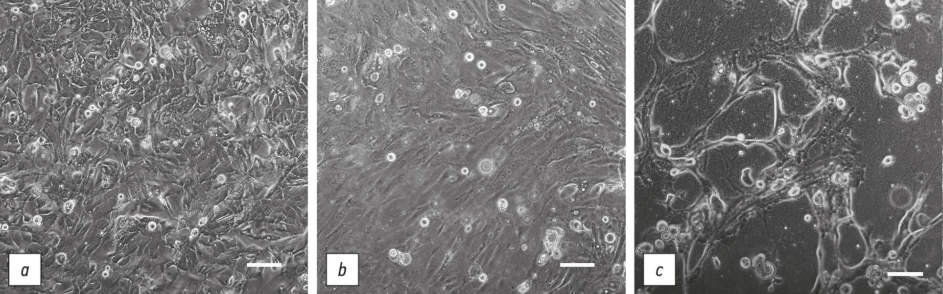 Рис. 3. Первичные культуры эпителиальных клеток конъюнктивы (фазово-контрастная микроскопия): a — контрольная группа (пластик); b — посев на коллагеновую мембрану в концентрации 30 мг/мл; с — в концентрации 10 мг/мл. Бар 100 мкм.