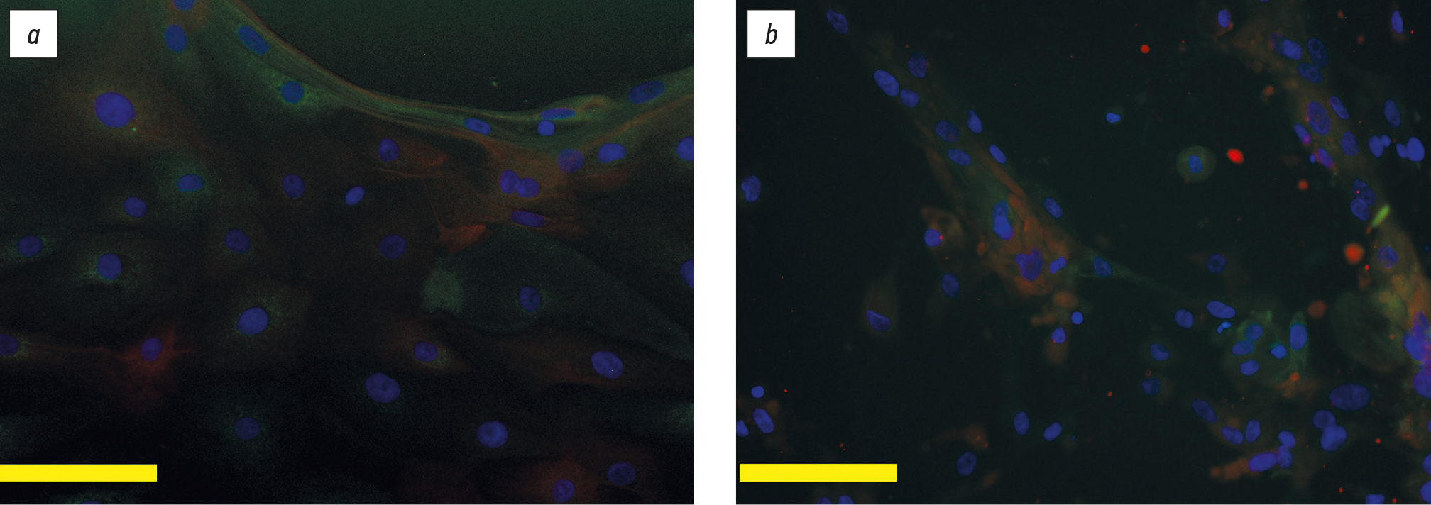 Рис. 4. Репрезентативные поля зрения при окрашивании культуры эпителиальных клеток конъюнктивы на пластике (a) и на коллагеновой мембране с концентрацией коллагена 30 мг/мл (b) на 3-и сутки после посева. Красное окрашивание — цитокератин 7; зелёное окрашивание — муцин 5АC; синее окрашивание — ядра, меченные красителем Hoechst. Бар 100 мкм.