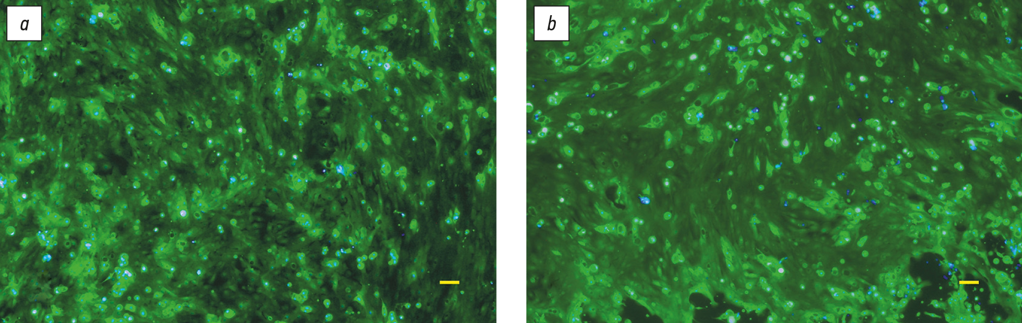 Рис. 5. Культура эпителиальных клеток конъюнктивы 3-го пассажа на 13-е сутки культивирования (эпифлуоресцентная микроскопия). Живые клетки окрашены зелёным цветом (окраска кальцеином АМ): a — в группе контроля, b — после посева на коллагеновую мембрану с концентрацией коллагена 30 мг/мл. Бар 100 мкм.