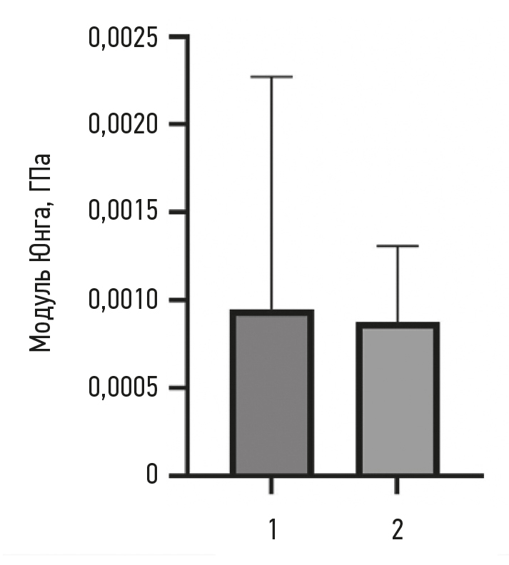 Рис. 7. Графическое отображение результатов наноиндентирования в статическом режиме: 1 — показатели модуля Юнга бульбарной конъюнктивы при нагрузке 0,75 мН; 2 — модуль Юнга коллагеновой мембраны с концентрацией коллагена 30 мг/мл при нагрузке 0,75 мН.