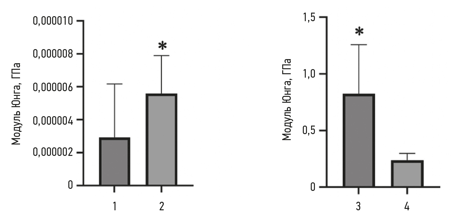 Рис. 8. Графическое отображение результатов наноиндентирования в динамическом режиме: a: 1 — показатели твёрдости бульбарной конъюнктивы при нагрузке 0,75 мН; 2 — показатели твёрдости коллагеновой мембраны с концентрацией коллагена 30 мг/мл при нагрузке 0,75 мН; b: 3 — показатели вязкой составляющей бульбарной конъюнктивы при нагрузке 0,75 мН, 4 — показатели вязкой составляющей коллагеновой мембраны с концентрацией коллагена 30 мг/мл при нагрузке 0,75 мН. * — статистически значимые отличия.