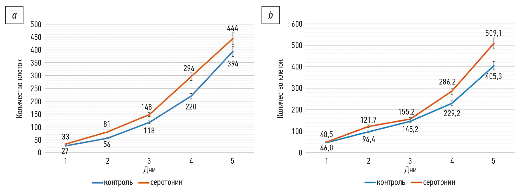 Рис. 1. Показатели прироста клеток в условиях введения серотонина адипината относительно контроля (n=6) при ежедневном подсчёте по 30 полей зрения в сериях эксперимента: a — кривая прироста ФД (n=6); b — кривая прироста МСК-ПЖК (n=6). ФД — фибробласты дермы, МСК-ПЖК — мезенхимальные стромальные клетки подкожной жировой клетчатки.