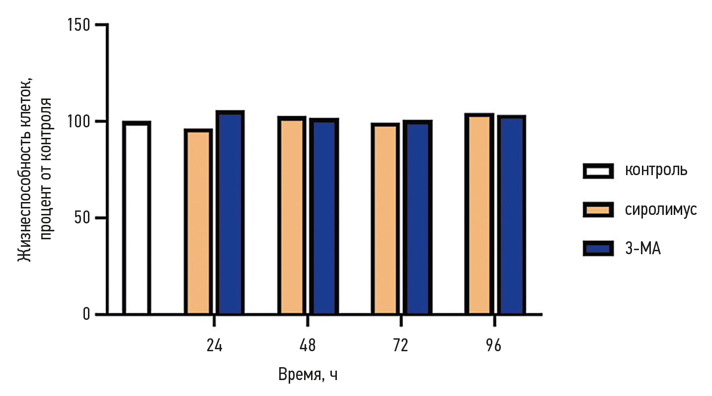 При оценке жизнеспособности ММСК после культивирования с активатором и ингибитором аутофагии в течение 24, 48, 72, 96 ч отмечен высокий уровень жизнеспособных клеток — более 96% во всех наблюдениях. Статистически значимых изменений между исследуемыми группами не получено (рис. 1).