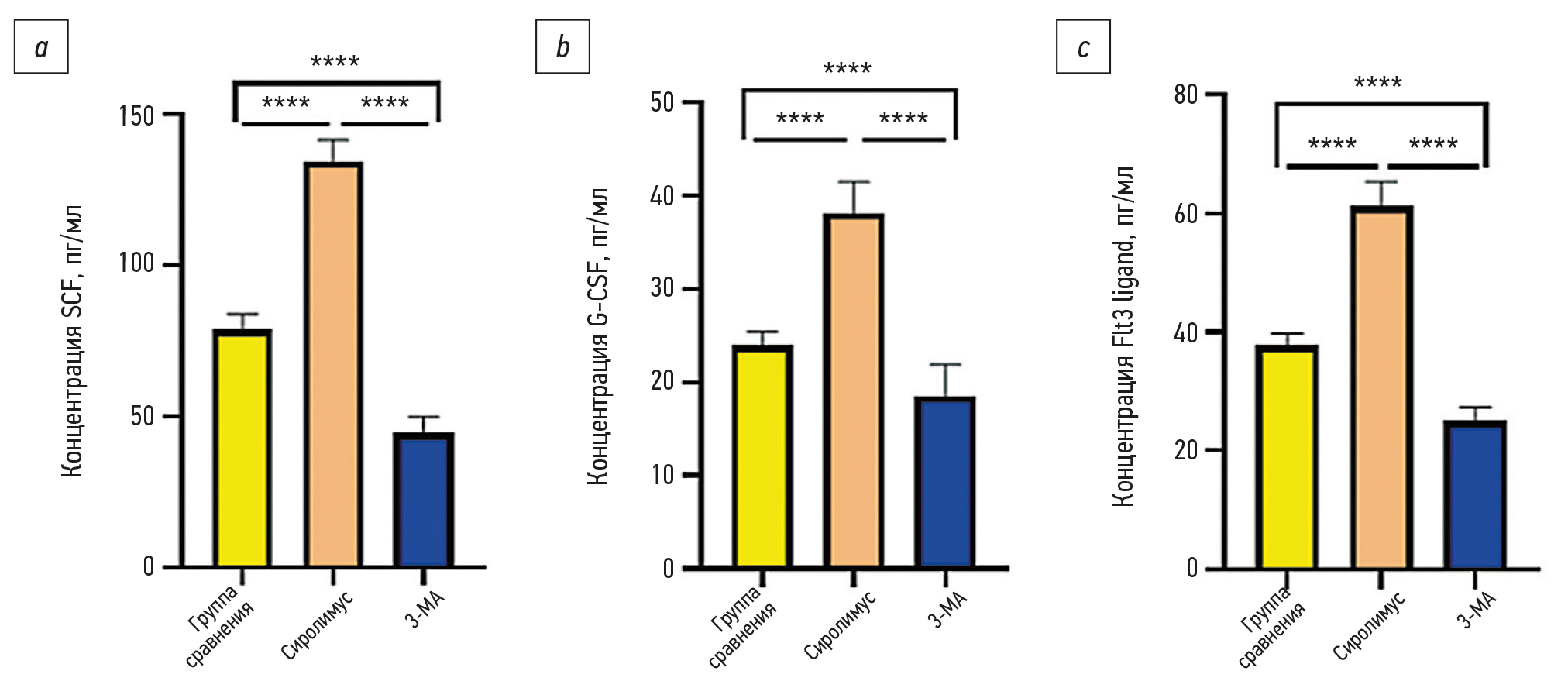 Рис. 3. Содержание факторов роста при культивировании мультипотентных мезенхимальных стромальных клеток (ММСК) в течение 24 ч с модуляторами аутофагии сиролимусом и 3-метиладенином: a — измерение концентрации фактора стволовых клеток (SCF) методом иммуноферментного анализа с помощью набора Mouse SCF ELISA Kit (Abcam, Великобритания); b — измерение концентрации колониестимулирующего фактора (G-CSF) методом иммуноферментного анализа с помощью набора Mouse G-CSF ELISA Kit (Abcam, Великобритания); c — измерение концентрации лиганд fms-подобной тирозинкиназы 3 (FLT3 ligand) методом иммунноферментного анализа с помощью набора Mouse FLT3 ligand ELISA Kit (Abcam, Великобритания); **** различия статистически значимы при р < 0,0001. Группа сравнения — с трансплантацией ММСК; Сиролимус — ММСК, культивированные с активатором аутофагии сиролимусом в концентрации 3 мкмоль/л; 3-МА — ММСК, культивированные с ингибитором аутофагии 3-метиладенином в концентрации 10 мкмоль/л.