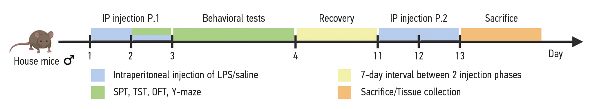 Fig. 1. Study design. SPT, Sucrose Preference Test; TST, Tail Suspension Test; OFT, Open Field Test; Y-maze, Y-maze test. IP injection, intraperitoneal injections of lipopolysaccharide/saline.