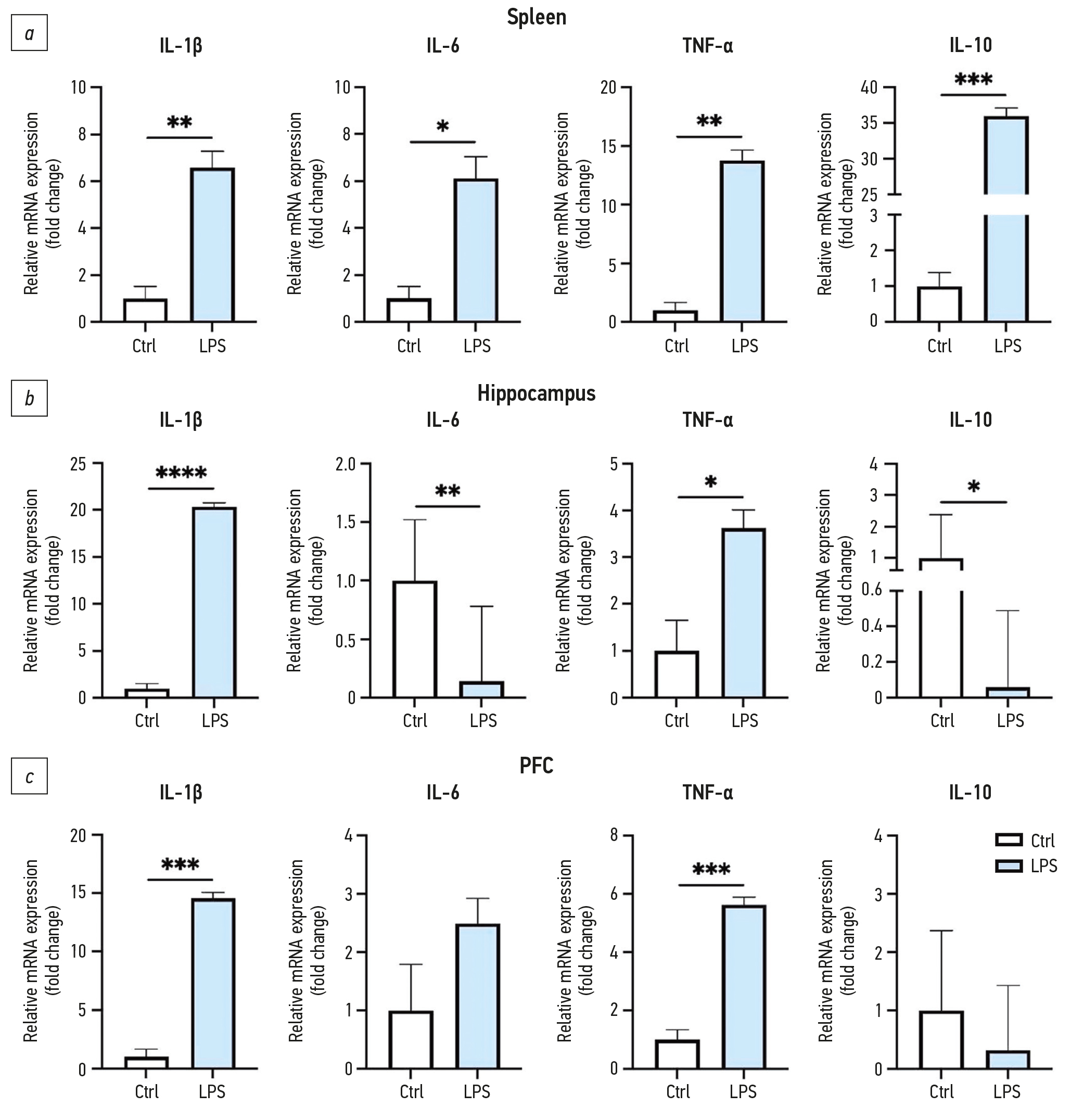 Рис. 3. Уровни экспрессии про- и противовоспалительных цитокинов в селезёнке, гиппокампе и префронтальной коре мышей в ответ на введение LPS: a–c — уровни экспрессии генов. LPS — липополисахарид, Ctrl — контрольная группа, TNF-α — фактор некроза опухоли α, IL — интерлейкины-1β, -6 и -10 соответственно, PFC — префронтальная кора, mRNA — матричная рибонуклеиновая кислота; n = 7/7 (Ctrl/LPS) для рис. а; n = 8/8 (Ctrl/LPS) для рис. b, c. Данные представлены как средние ± SEM; * p ≤ 0,05; ** p ≤ 0,01; *** p ≤ 0,001; **** p ≤ 0,0001 (t-тест).