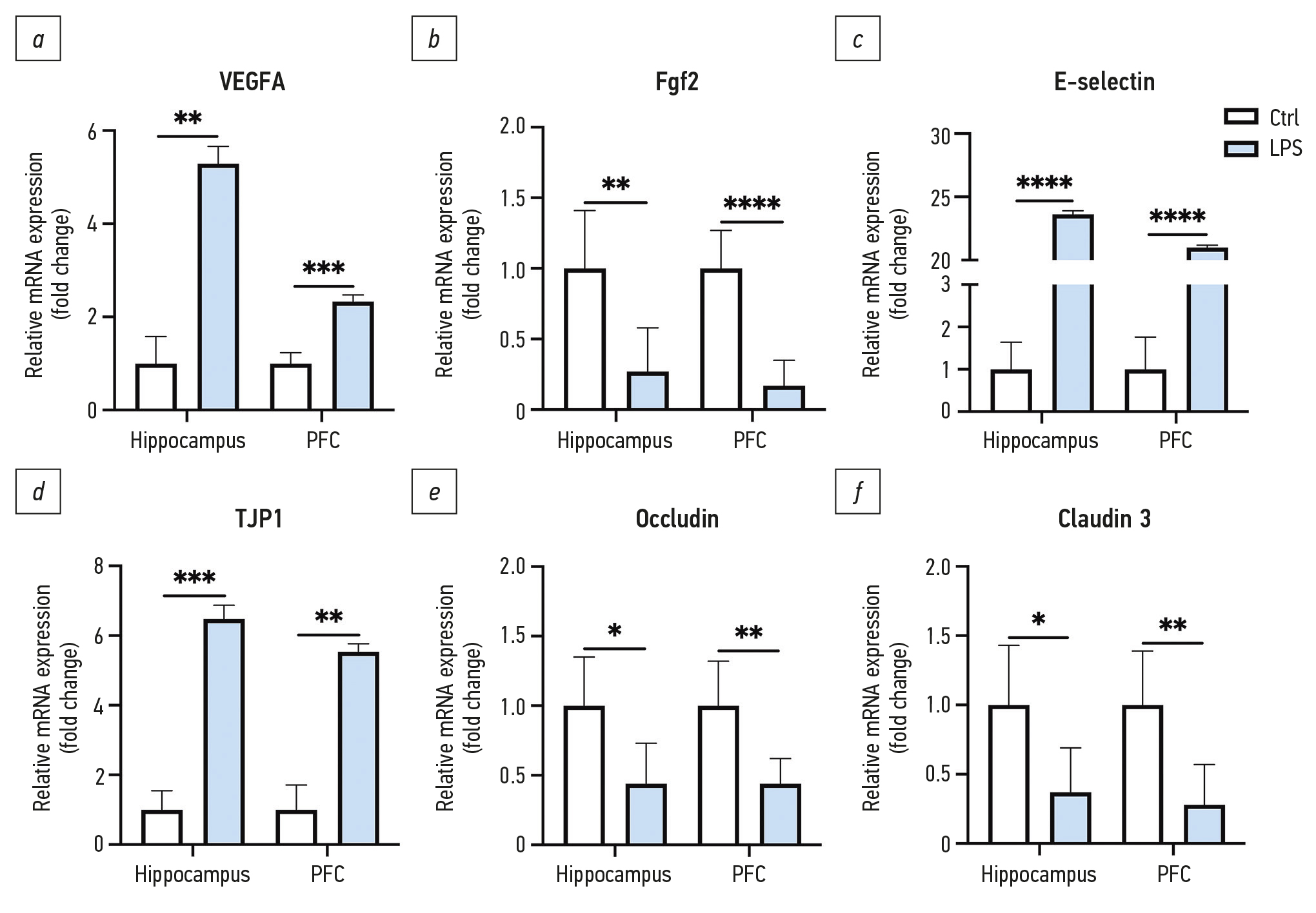 Рис. 4. Уровни экспрессии маркёров и регуляторов проницаемости ГЭБ в гиппокампе и префронтальной коре мышей в ответ на введение LPS: a–f — уровни экспрессии генов. LPS — липополисахарид, Ctrl — контрольная группа, VEGFА — фактор роста эндотелия сосудов А, FGF2 — фактор роста фибробластов 2, E-selectin — CD62-подобный антиген семейства E, молекула адгезии эндотелиальных лейкоцитов 1, TJP1/ZO1 — белок плотных контактов 1/zonula occludens-1, Occludin, Claudin 3 — трансмембранные белки плотных контактов, PFC— префронтальная кора (ПФК); для VEGFА, FGF2, Occludin и Claudin 3 n = 9/10 (Ctrl/LPS), для E-selectin и TJP1 в ПФК n = 8/10 и n = 8/9 соответственно. Данные представлены как средние ± SEM; * p ≤ 0,05; ** p ≤ 0,01; *** p ≤ 0,001; **** p ≤ 0,0001 (t-тест, тест Манна–Уитни).
