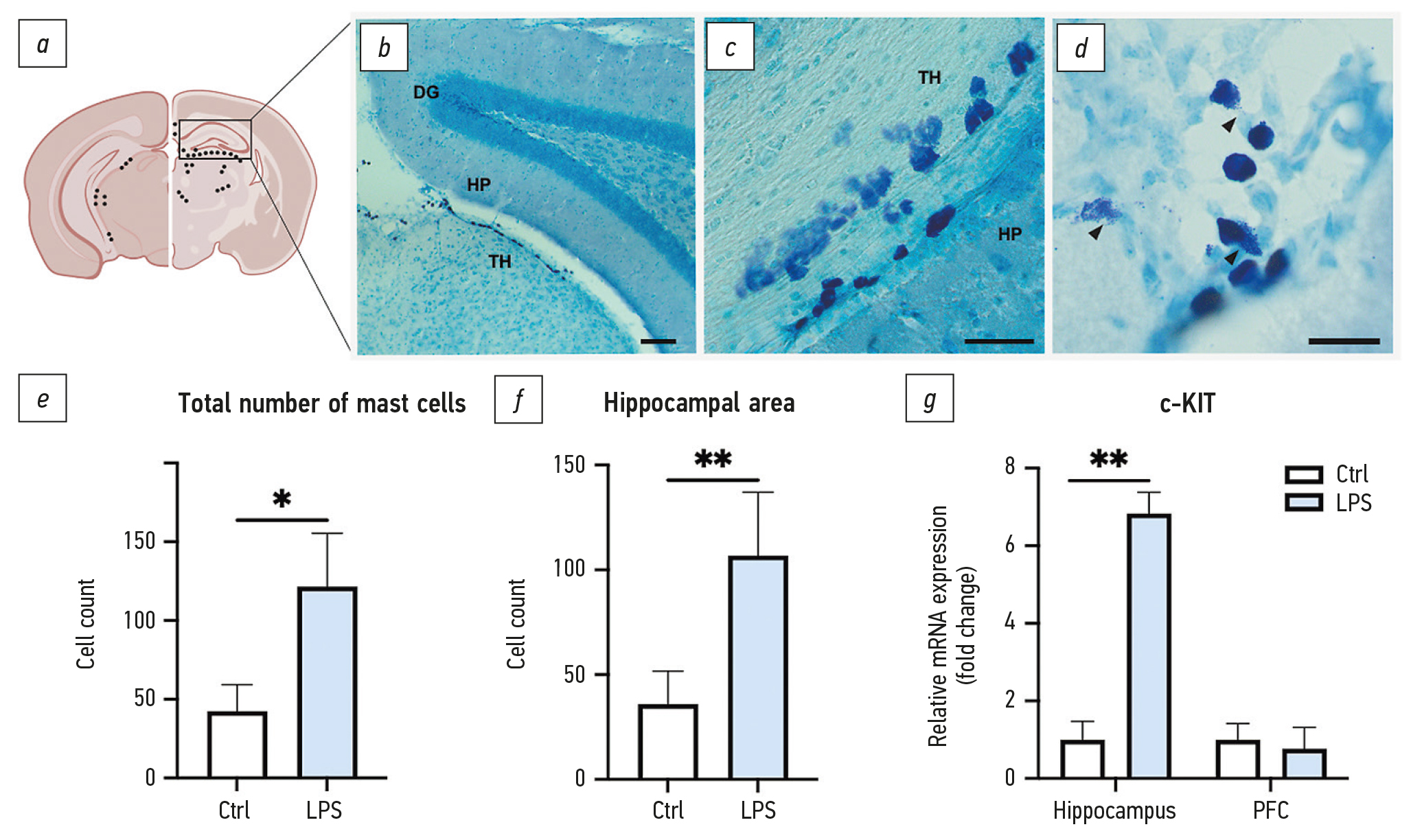 Fig. 5. Mast cells in the mice brain after LPS treatment: a, distribution of mast cells in the frontal section of the mice brain; b–d, corresponding micrographs showing stained granulocytes in the perivascular space between the hippocampus and thalamus; e, f, total count of mast cells identified in brain slices and the hippocampal area, including the perivascular space between HP and TH; g, c-KIT expression in response to LPS injections. Arrowheads in d show degranulating mast cells. LPS, lipopolysaccharide; Ctrl, control group; HP, hippocampus; TH, thalamus; DG, dentate gyrus; PFC, prefrontal cortex; n = 10/8 (Ctrl/LPS) for e, f; n = 9/10 (Ctrl/LPS) for g. Scale bar = 100 (b), 50 (c), and 25 (d) μm. Data are presented as mean values ± SEM; * p ≤ 0.05, ** p ≤ 0.01 (t-test, MannWhitney test).