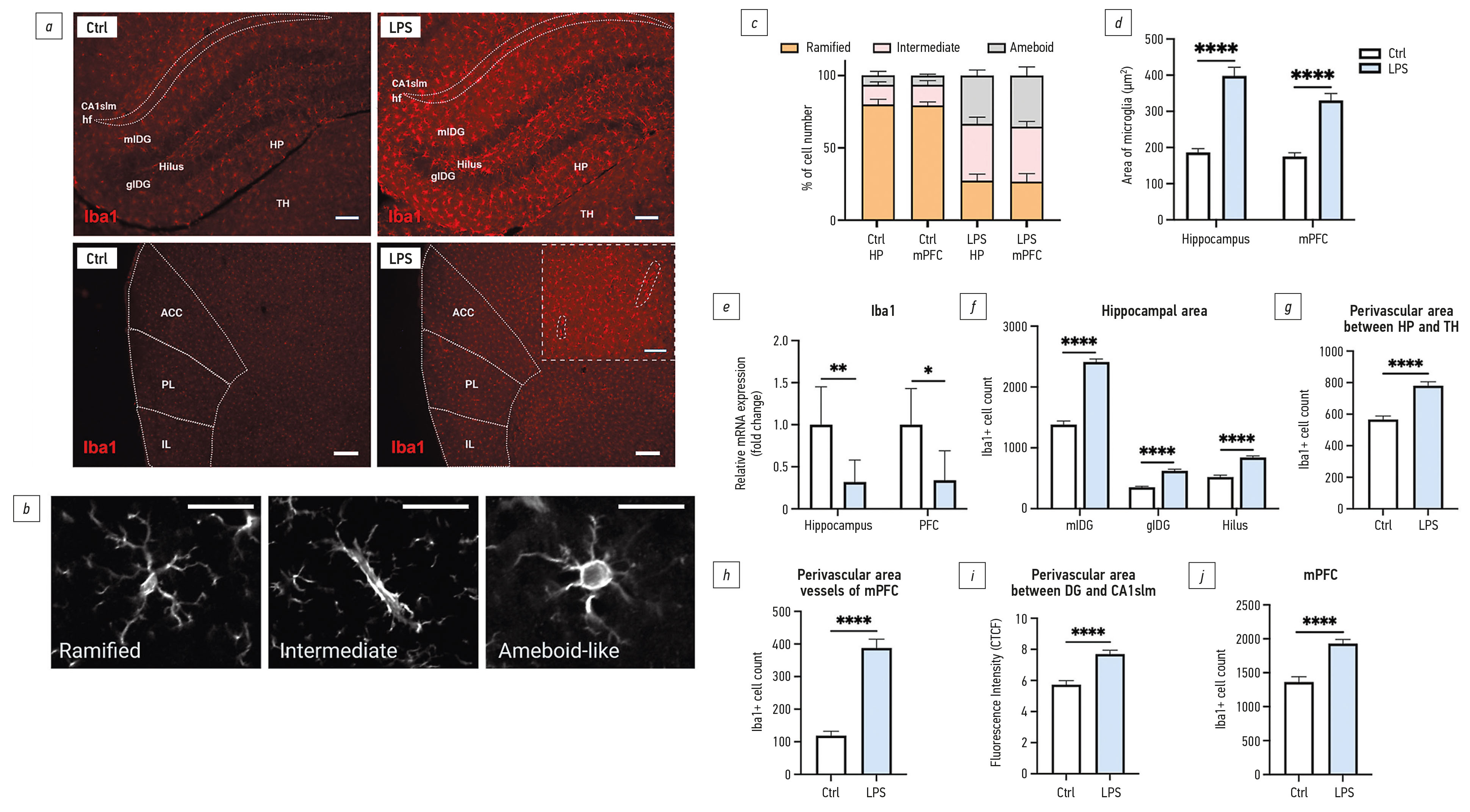 Fig. 6. Microglial proliferation in response to LPS administration in the mlDG, glDG, hippocampal hilus, perivascular area between HP and TH, perivascular area between DG and CA1slm, mPFC regions (ACC, PL, and IL), and perivascular areа vessels of mPFC: a, representative fluorescent microscopy immunohistochemical images of Iba1 (red fluorescence) in the hippocampus and mPFC area; b, representative confocal microscopy immunohistochemical images of the ramified, intermediate and ameboid phenotypes of Iba1+ cells; c, d, percentage ratio of microglial phenotypes and microglial area in the hippocampus and mPFC area; e, expression of Iba1 in the hippocampus and prefrontal cortex of mice in response to chronic LPS treatment; f–h, j Iba1+ cell count; i, CTCF of Iba1+ cells in the perivascular area between DG and CA1slm. LPS, lipopolysaccharide; Ctrl, control group; Iba1, ionized calcium-binding adaptor molecule 1; HP, hippocampus; TH, thalamus; DG, dentate gyrus; mlDG, molecular layer of dentate gyrus; glDG, granular layer of dentate gyrus; CA1slm, stratum lacunosum-moleculare of CA1 field; hf, hippocampal fissure; mPFC, medial prefrontal cortex; ACC, anterior cingulate cortex; PL, prelimbic cortex; IL, infralimbic cortex; n = 9/10 (Ctrl/LPS) for e; n = 10/9 (Ctrl/LPS) for c, d, f–j. Scale bar = 100 μm for the hippocampal area, 200 μm for mPFC, 20 μm for Iba1+ phenotypes. Data are presented as mean values ± SEM; * p ≤ 0.05, ** p ≤ 0.01, **** p ≤ 0.0001 (t-test, Mann–Whitney test).