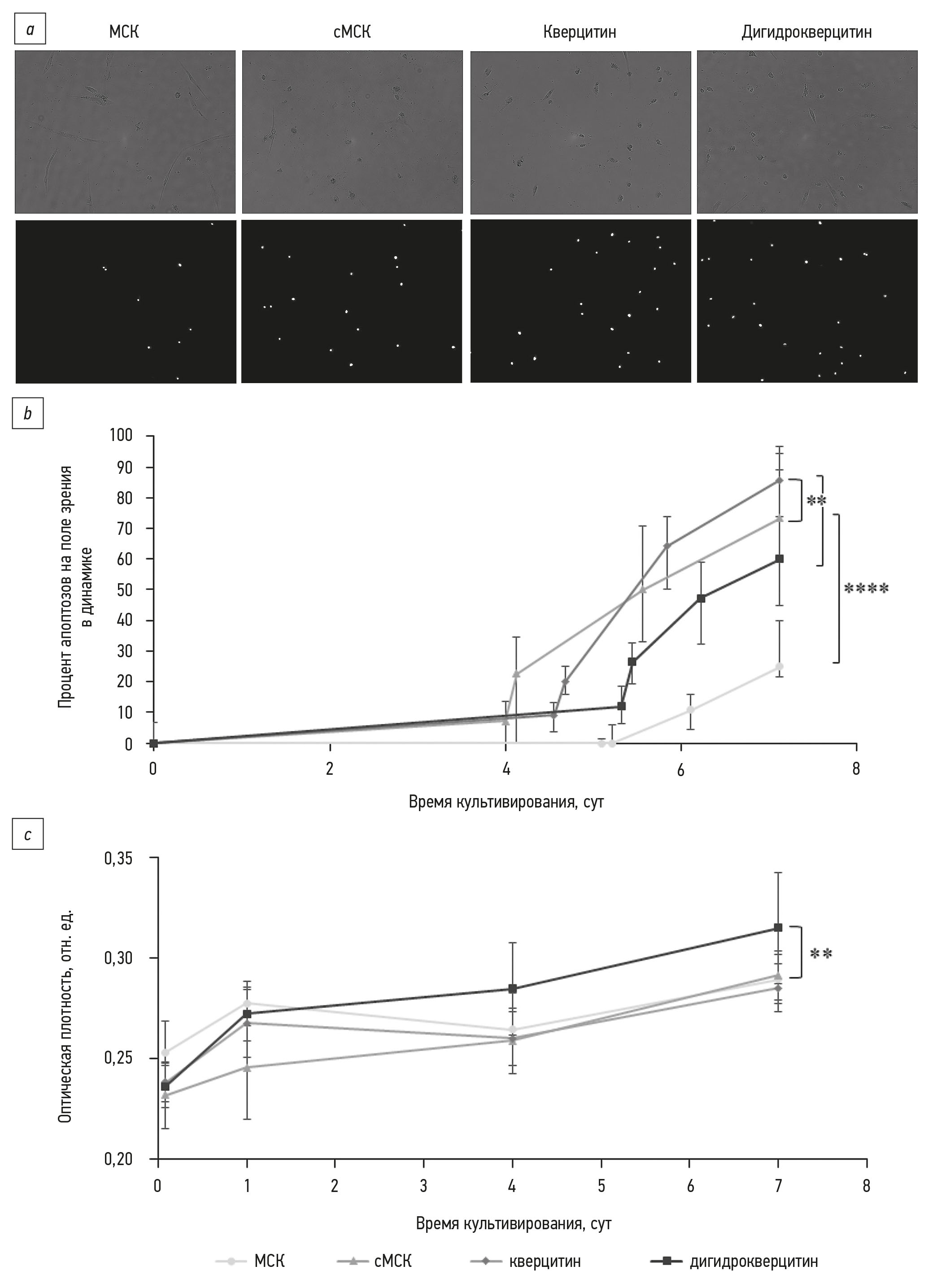 Рис. 3. Оценка влияния сенолитиков на апоптоз и жизнеспособность первично выделенных сМСК: a — микрофотографии клеток на 7-й день культивирования в среде с сенолитиками, верхняя панель: фазово-контрастные изображения клеток, нижняя панель: окраска ядер мёртвых клеток с помощью этидиума гомодимера-1 (×10); b — оценка количества апоптозов относительно общего количества клеток на поле зрения в процентном соотношении в динамике в течение 7 дней культивирования; c — жизнеспособность клеток в течение 7 дней при культивировании в среде с сенолитиками (ХТТ-тест). Данные представлены как медиана с квартилями [25%; 75%] для диаграммы b и как среднее значение со стандартным отклонением для диаграммы c, а статистические значимые различия между группами относительно контролей (МСК и сМСК без воздействия сенолитиков) обозначены следующим образом: ** p < 0,05; **** p < 0,0001. МСК — мезенхимные стволовые/стромальные клетки от молодых доноров; сМСК — сенесцентные МСК, полученные от пожилых доноров; кверцитин — сМСК под воздействием кверцетина; дигидрокверцитин — сМСК под воздействием дигидрокверцетина.