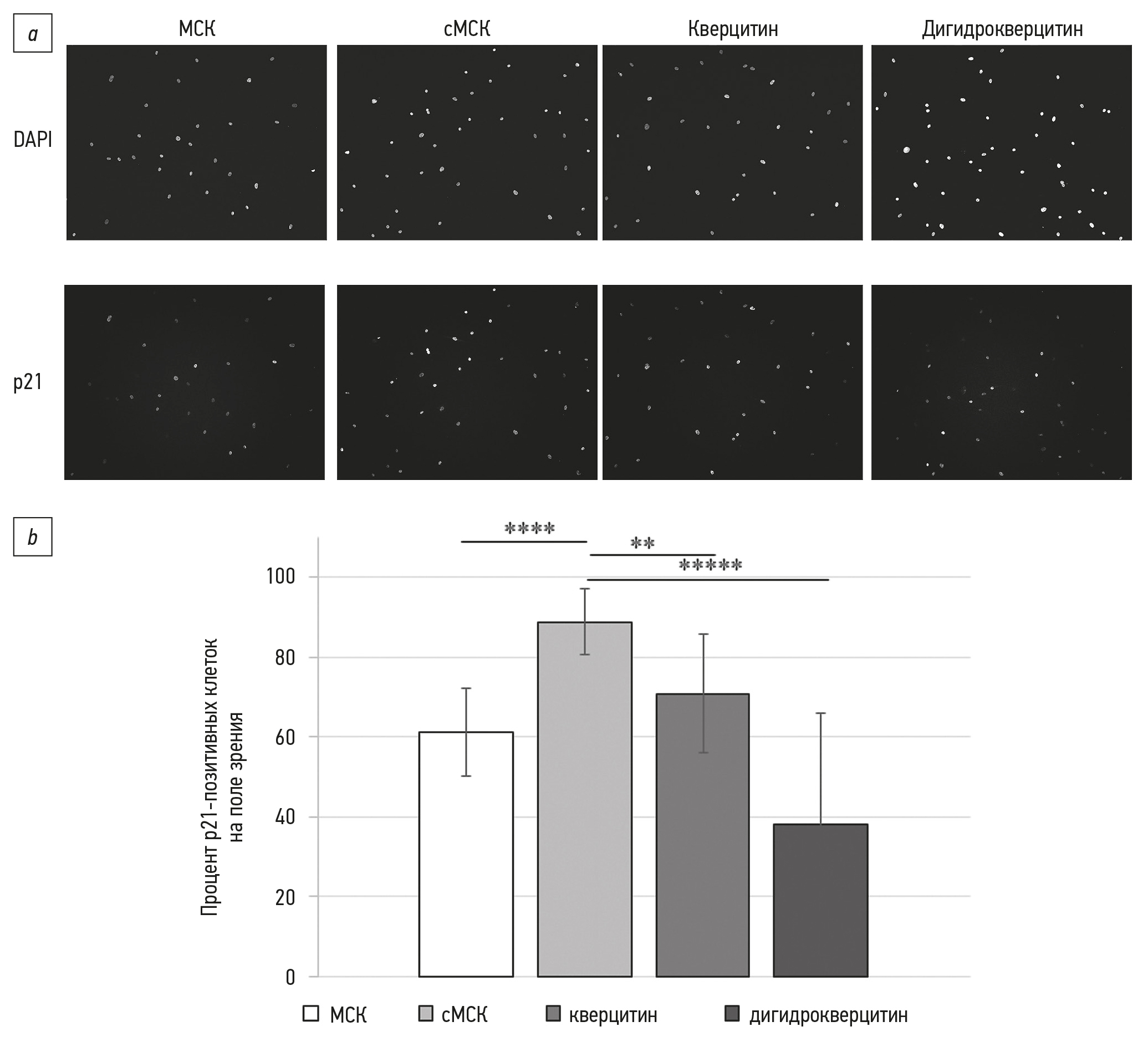 Fig. 4. Evaluation of the effects of senolytics on the expression of the senescence biomarker p21 in primary senescent mesenchymal stem/stromal cells: a, micrographs on the 4th day of cultivation in the senolytic medium; upper panel: DAPI nuclear staining; lower panel: immunocytochemical nuclear staining of p21-positive cells (×10); b, evaluation of the number of p21-positive cells relative to the total number of cells in the field of view, expressed as a percentage. The data are presented as means and standard deviations, whereas statistically significant differences between the groups are indicated as follows: **, p < 0.05; ****, p < 0.0005, and *****, p < 0.0001. МСК, mesenchymal stem/stromal cells from young donors; сМСК, senescent MSCs obtained from elderly donors; кверцитин, quercetin-treated sMSCs; дигидрокверцитин, dihydroquercetin-treated sMSCs.