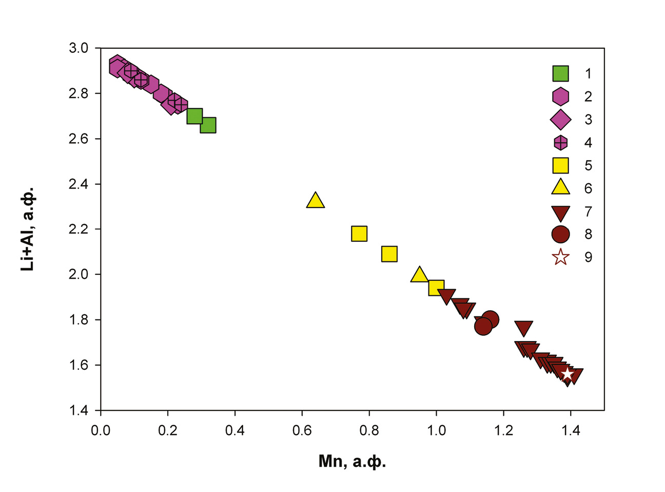 Fig. 6. Correlation between Mn and Li + Al in the Y site in minerals of the tourmaline supergroup from the Krutaya vein.