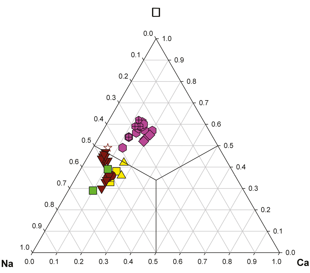 Выявленная заселенность позиции Х (рис. 8) уникальна для малханских турмалинов. Если зоны I и III сложены Na-доминантными минералами, то в розовой зоне II, несмотря на некоторое увеличение содержания Ca, фиксируется резкий дефицит Na при одновременном отсутствии K. В результате, в этой зоне можно выделить сразу три минеральных вида с доминирующей в позиции Х вакансией – фторроссманит, россманит и их O2–-аналог. Центральная часть зоны IV также обеднена Na и Ca. В центре кристалла в позиции X преобладает вакансия (при содержании 1.4 мас. % Na2O и 0.35 мас. % CaO), а турмалин может быть отнесен к Mn2+-F-аналогу фойтита. При движении к границе зоны содержания обоих компонентов (Na2O и CaO) начинают неуклонно расти, достигая соответственно 1.7 и 0.75 мас. % у границы зоны. Переход от Mn2+-F-аналога фойтита к фтортсилаизиту происходит по схеме X□ + YAl3+→ XNa+ + YMn2+.