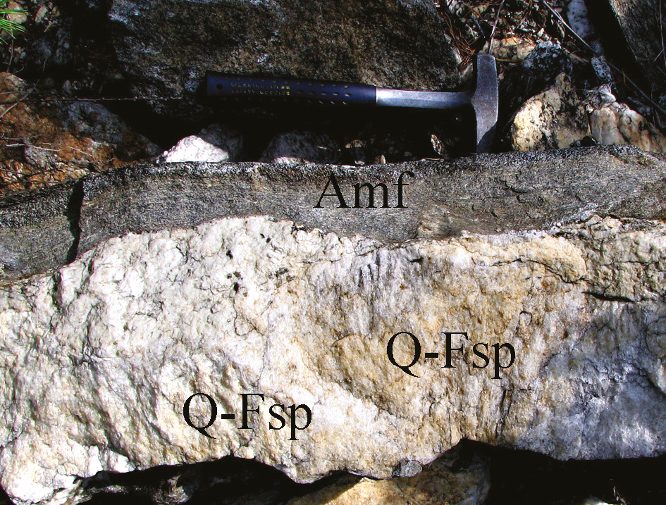 Fig. 3. Quartz vein with granitoid relics (Q-Fsp) at the contact with amphibolites (Amf).