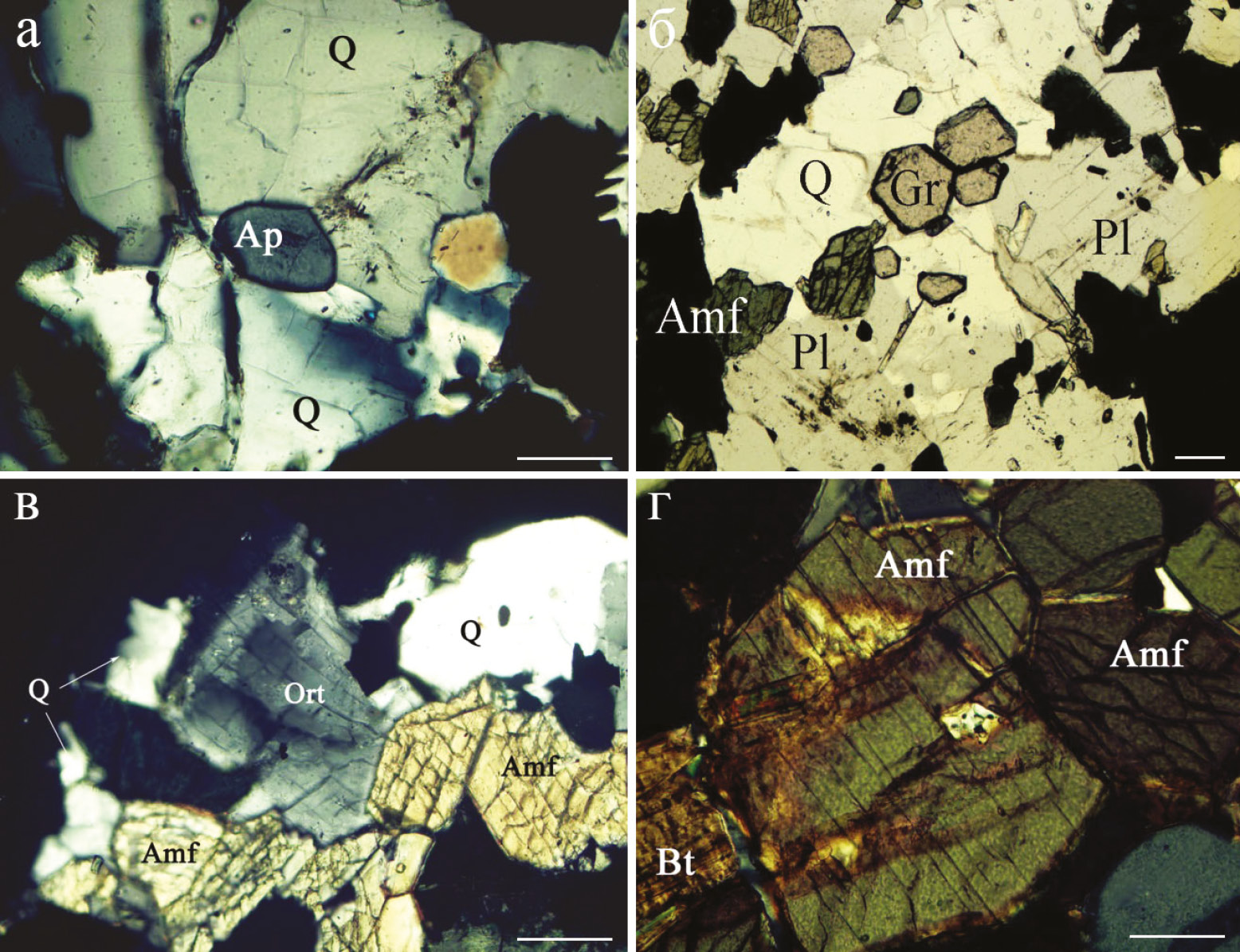 В шлифах все минералы амфиболитов в разной степени деформированы: одни содержат внутризерновые трещины хрупкой деформации, другие – раздроблены и фрагментированы. В них наблюдаются признаки пластической деформации, проявленные в волнистом погасании. В этом отношении наиболее показательным минералом является белый кварц. Он представлен двумя генерациями. Кварц первой генерации размером от 0.1 до 2.0–3.0 мм имеет коррозионные границы и волнистое погасание. В зернах наблюдаются внутризерновые трещины хрупкой деформации и полости, каналы и щелевидные трещины растворения. В кварце встречаются включения апатита размером 0.1–1.0 мм, в щелевидных трещинах – новообразованный кварц второй генерации (рис. 4а). Кварц второй генерации присутствует в полостях в виде мелких зерен с прямолинейными границами и характеризуется однородным погасанием, не содержит флюидных включений и следов деформации.