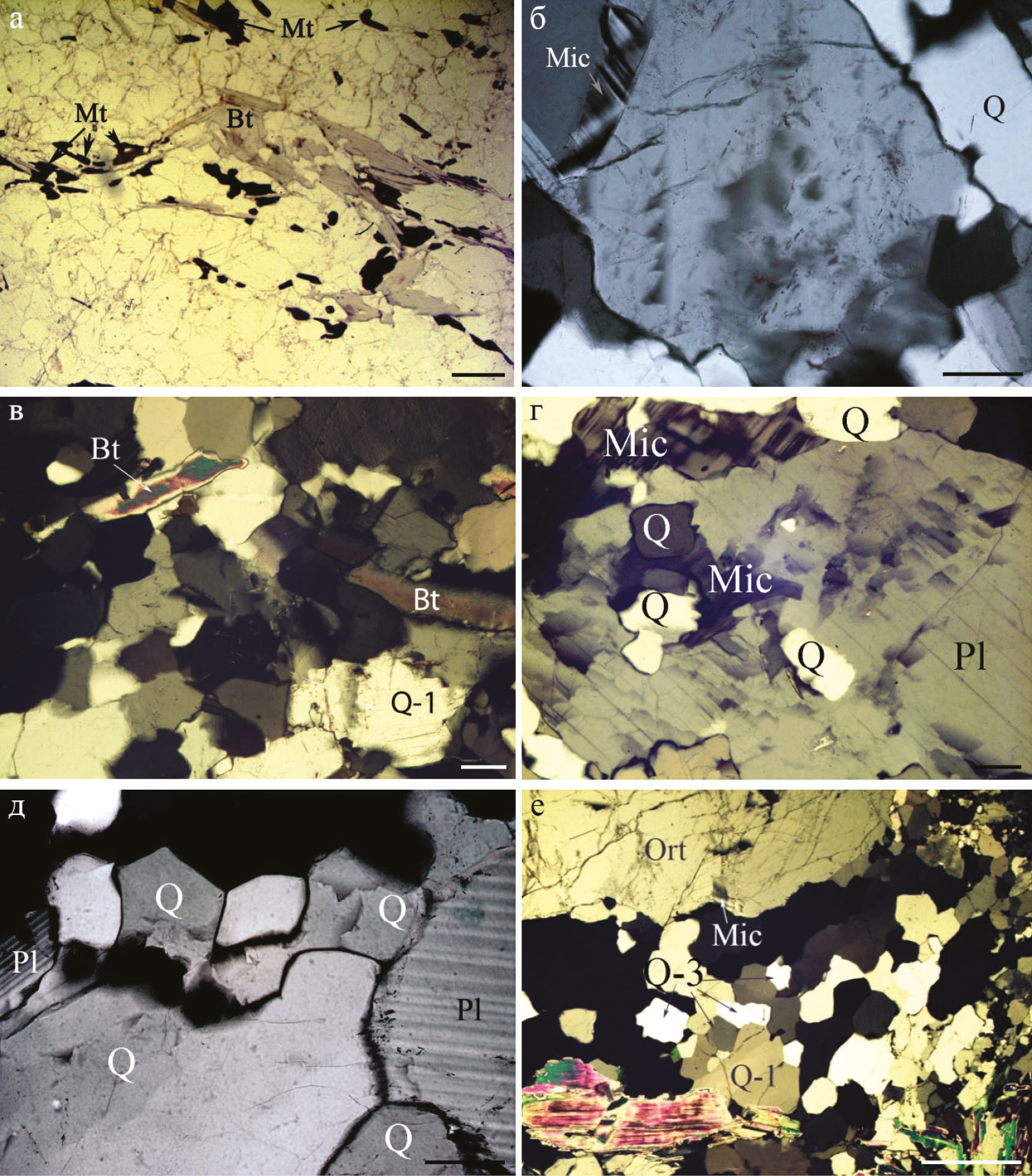 Fig. 5. Features of deformation and dissolution in gneiss: a – gneiss texture with oriented biotite (Bt) and magnetite (Mt); б – shadow zones – traces of dissolution in quartz (Q) and microcline (Mic) at the contact with plagioclase; в – features with dissolution in quartz grains (Q-1) and corrosion boundary; г – traces of dissolution in quartz grains and plagioclase; д – dissolution cavities in quartz and areas with a polygonal structure; e – area with quartz aggregate of polygonal structure (Q-3) and relics of original quartz (Q-1). Thin section with (б–е) and without (a) analyzer. Scale bar is 0.5 (a), 0.1 (б–д), and 1 (е) mm.