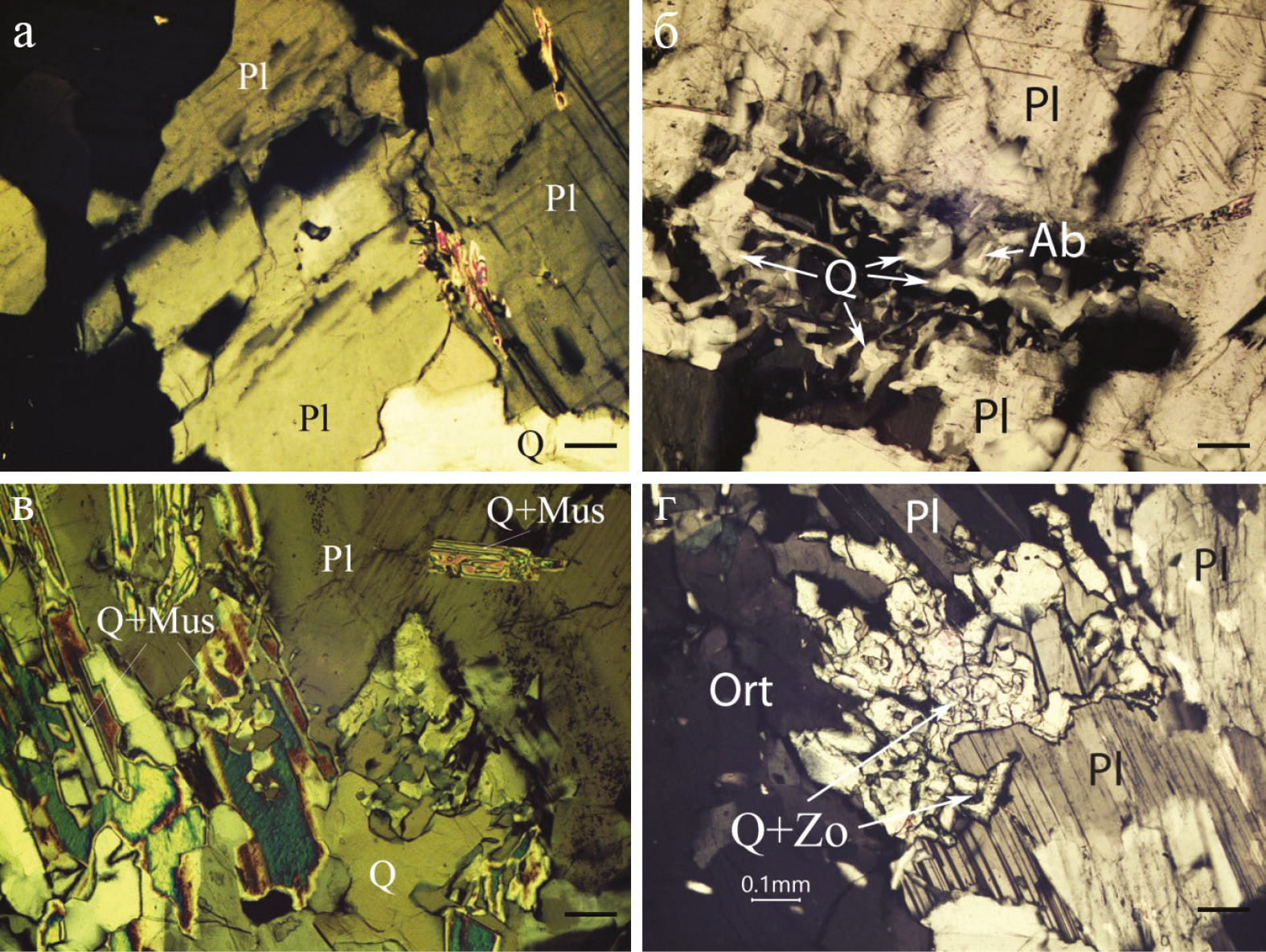 Рис. 6. Обособление гранитного состава: а – деформированные зерна плагиоклаза (Pl) со щелевидными следами растворения; б – полость растворения в плагиоклазе с кварц-альбитовым агрегатом (Ab+Q); в – плагиоклаз (Pl) со следами растворения и кварц-мусковитовым симплектитом (Q+Mus); г – плагиоклаз (Pl) со следами деформации, растворения и коррозионными границами на контактах с ортоклазом (Ort), кварц-цоизитовый симплектит (Q+Zo).