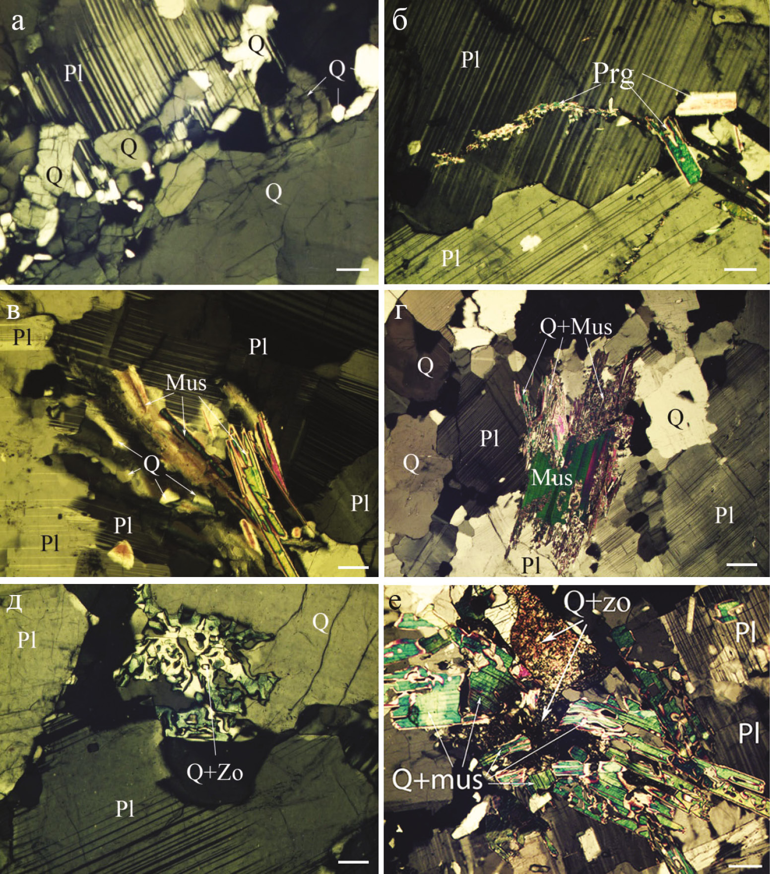 Линзовидные и ксеноморфные скопления биотита и мусковита (часто с преобладанием последнего) приурочены к интенсивно деформированным участкам, где слюды выполняют трещины в плагиоклазе (рис. 7б). Более крупные пластинки мусковита часто изогнуты, иногда фрагментированы. Плагиоклаз деформирован, местами в нем встречаются механические двойники. Границы зерен зубчатые, коррозионные (рис. 7в). Исходные зерна кварца разбиты трещинами, часто раздроблены и фрагментированы, в некоторых видны следы растворения. Признаки растворения отмечаются и в плагиоклазе (рис. 7г). На границе кварца и плагиоклаза встречаются кварц-мусковитовые симплектиты с неоднородным строением. Центральные части сростков существенно мусковитовые, краевые части сложены срастаниями тонких пластинок мусковита с мелкими каплевидными зернами кварца (рис. 7г). Здесь же наблюдаются кварц-клиноцоизитовые симплектиты, в которых кварц имеет преимущественно скелетную форму (рис. 7д). В других участках отмечаются кварц-мусковитовые и кварц-клиноцоизитовые симплектиты. Кварц-мусковитовые симплектиты повсеместно деформированы и фрагментированы. Между фрагментами могут находиться кварц-клиноцоизитовые симплектиты без следов деформации. Судя по характеру взаимоотношений, кварц-клиноцоизитовый симплектит образовался позже кварц-мусковитового (рис. 7е).