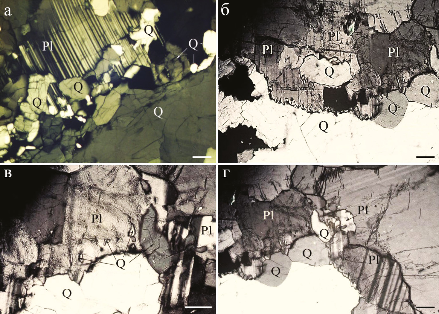 Кварц-полевошпатовые агрегаты в жиле имеют переменное количество минералов и различную зернистость. Степень тектонического воздействия на них проявлена по-разному. Наиболее интенсивное преобразование минералов отмечаются в зонах дробления и милонитизации. Изменяется структура от исходной гипидиоморфнозернистой, характерной для гранитов, до микрогранокластовой в комбинации с микрогранобластовой, состоящей из зерен размером от 0.01 до 1.0 мм. Наряду с обломками зерен кварца и плагиоклаза повсеместно встречаются новообразованные индивиды этих минералов, отличающиеся по форме и размеру, обычно более мелкие, чем исходные. Более крупные зерна кварца размером 0.10–0.15 мм местами раздроблены и фрагментированы (рис. 9а). В зоне интенсивного растворения граница между кварцевым агрегатом и плагиоклазом зубчатая. В плагиоклазе наблюдаются продольные и поперечные каналы растворения (рис. 9б) и включения кварца каплевидной формы (рис. 9в).