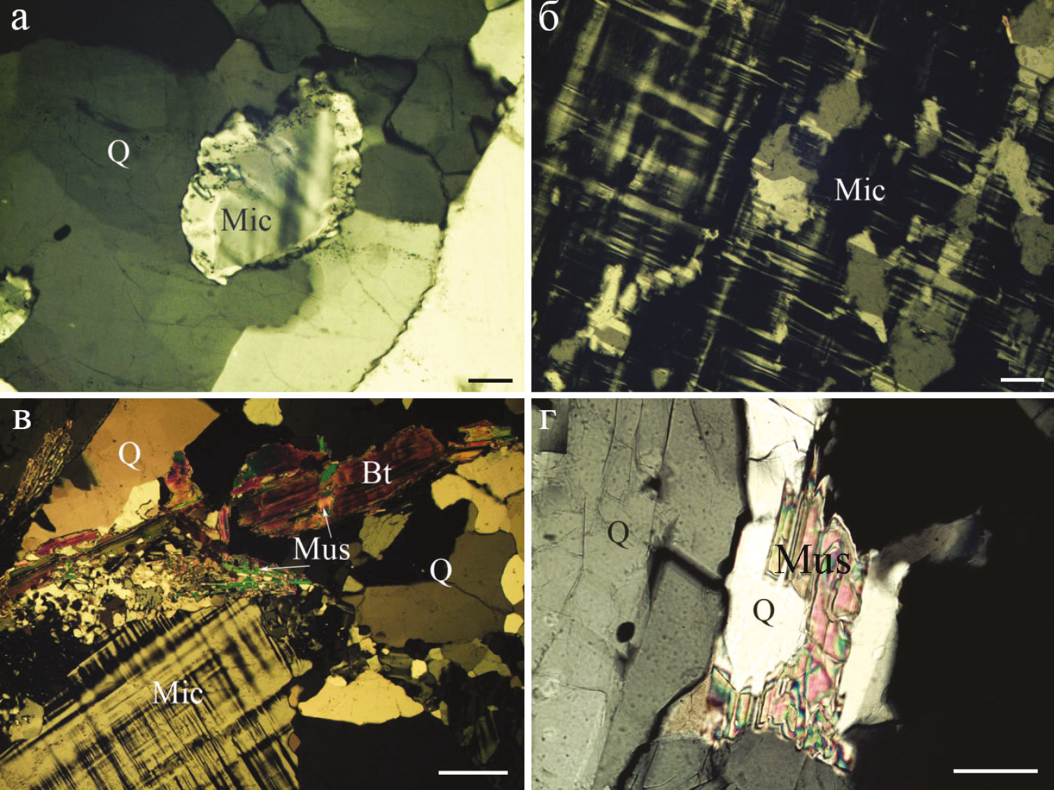 Fig. 10. Features of metasomatic transformation in quartz aggregate: a – formation of an albite-quartz contact around microcline; б – veins of quartz-albite composition in deformed microcline grains; в – zone of mylonitization and recrystallization at the microcline-quartz boundary with the formation of muscovite-quartz simplectite; г – muscovite in the quartz dissolution area. Thin section with analyzer. Scale bar is 0.1 (а, б, г) and 0.5 (в) mm.