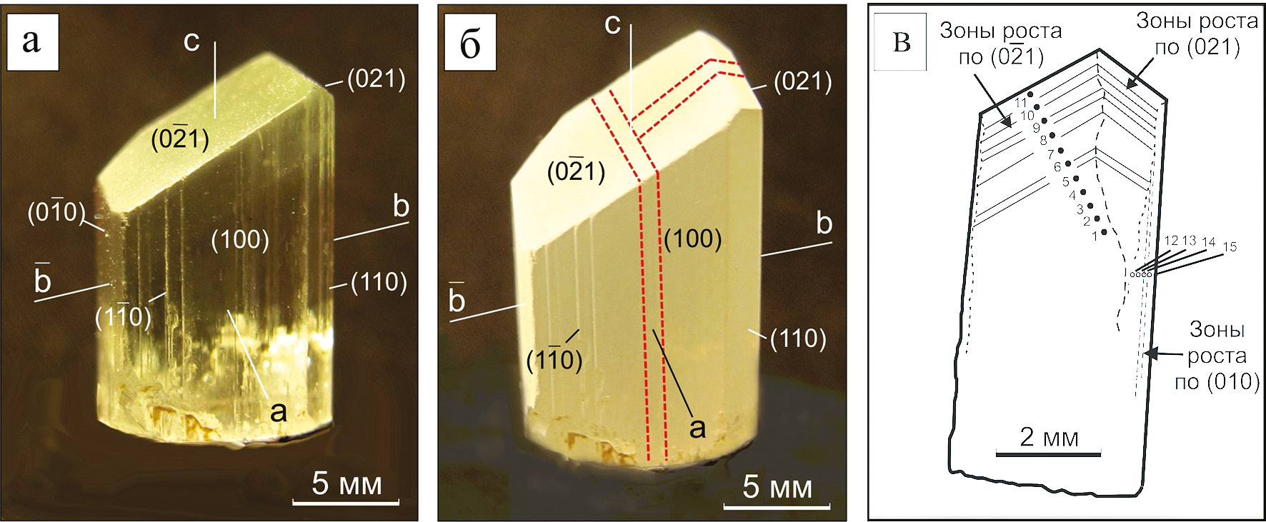 Рис. 3. Кристалл сподумена из полости («занорыша») в кварц-альбитовом пегматите (обр. № 1): а – общий вид с указанием кристаллографических простых форм по (Трегер, 1980); б – вид граней, напыленных хлористым аммонием, с указанием разрезов по (010) и (100); в – положение и номера точек анализа на поверхности пластинки, выпиленной по (100) (табл. 1). Кристаллографические оси – a, b, c.