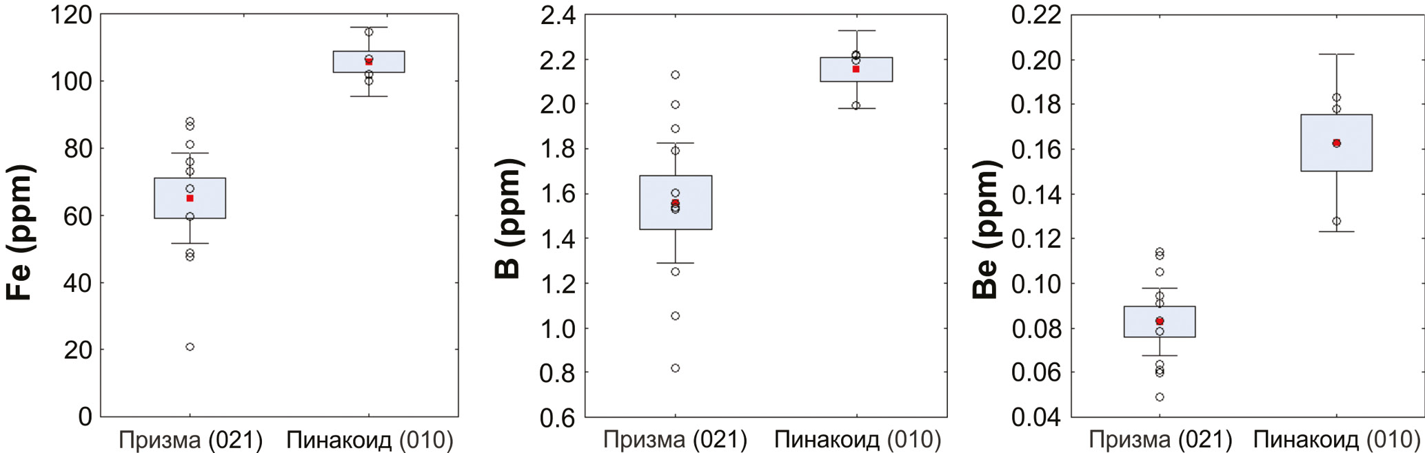 Образец № 1. Состав сподумена определен в 11 точках, расположенных в пирамиде роста грани призмы (021) и в четырех точках в секторе роста грани пинакоида (010) (рис. 3в; табл. 1). Сравнение среднего содержания элементов в пирамидах роста граней разных простых форм показало статистически значимое отличие содержаний Fe, Be и B в пирамиде роста грани пинакоида (010) и пирамиде роста грани призмы (021) (рис. 6). В 11 точках, расположенных в пирамиде роста грани призмы (021), содержание Fe варьирует от 20.7 до 87.9 г/т при среднем содержании 65.1 г/т; Ве – от 0.05 до 0.11 г/т (в среднем, 0.08 г/т); В – от 0.82 до 2.13 г/т (в среднем, 1.56 г/т). В четырех точках, находящихся в пирамиде роста грани пинакоида (010), содержание Fe составляет от 100 до 115 г/т при среднем значении 106 г/т; Ве – от 0.13 до 0.18 г/т (в среднем, 0.16 г/т); В – от 1.99 до 2.22 г/т (в среднем, 2.15 г/т).