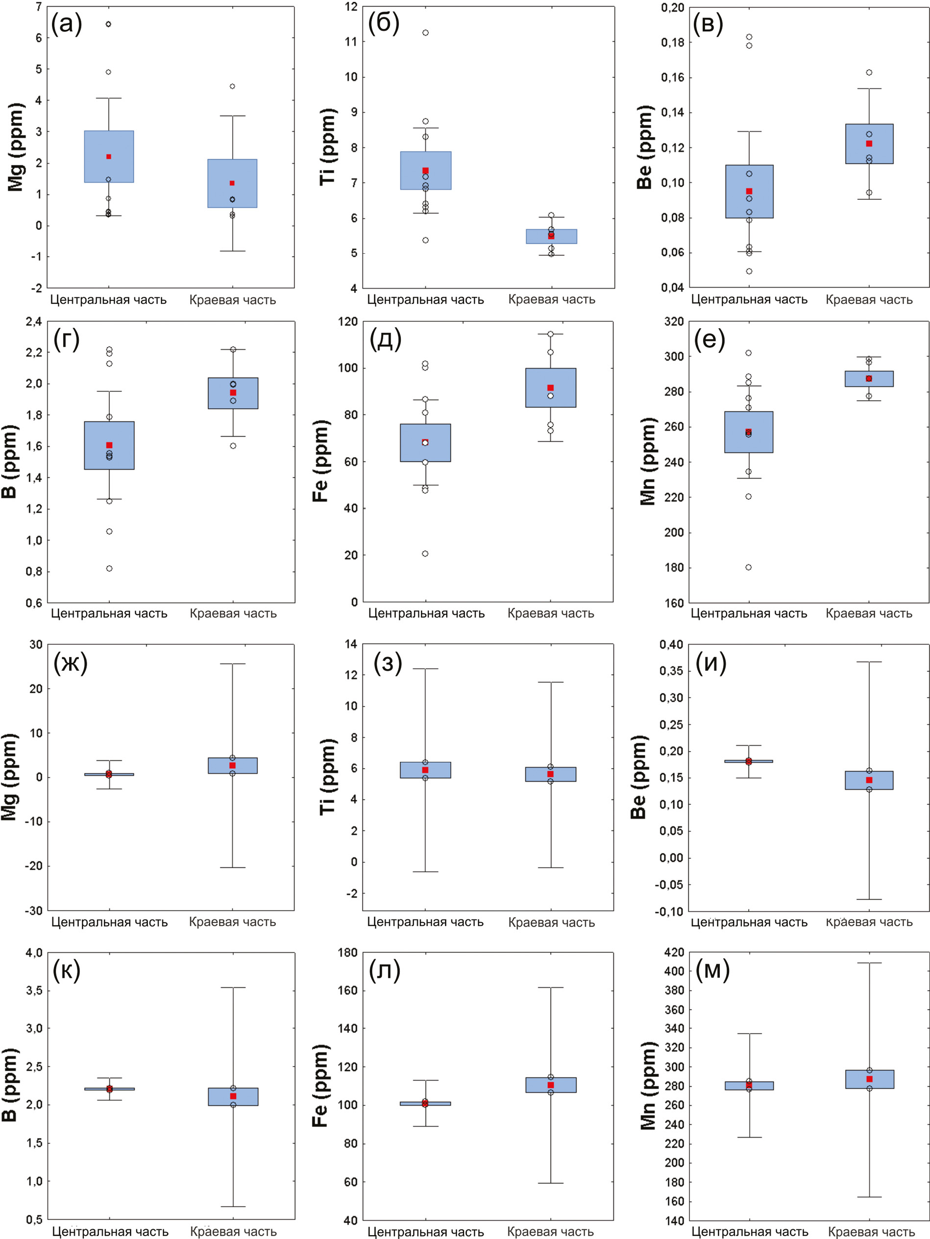 Содержание остальных проанализированных элементов не имеет существенного отличия в пирамиде роста указанных граней (табл. 1). Вместе с тем, в пирамиде грани (021) в направлении от ранних к поздним зонам роста отмечается тенденция к повышению содержания Be (от 0.05 до 0.11 г/т), B (от 0.82 до 1.60 г/т), Fe (от 20.7 до 73.1 г/т) и Mn (от 180 до 278 г/т), а также – к понижению содержания K (от 40.4 до 11.1 г/т), Rb (от 0.98 до 0.18 г/т) и Ti (от 11.2 до 5.69 г/т) (рис. 7а-е). Не отмечаются существенные колебания примесного состава по зонам и пирамидам роста грани пинакоида (010) для указанных элементов (рис. 7ж-м).