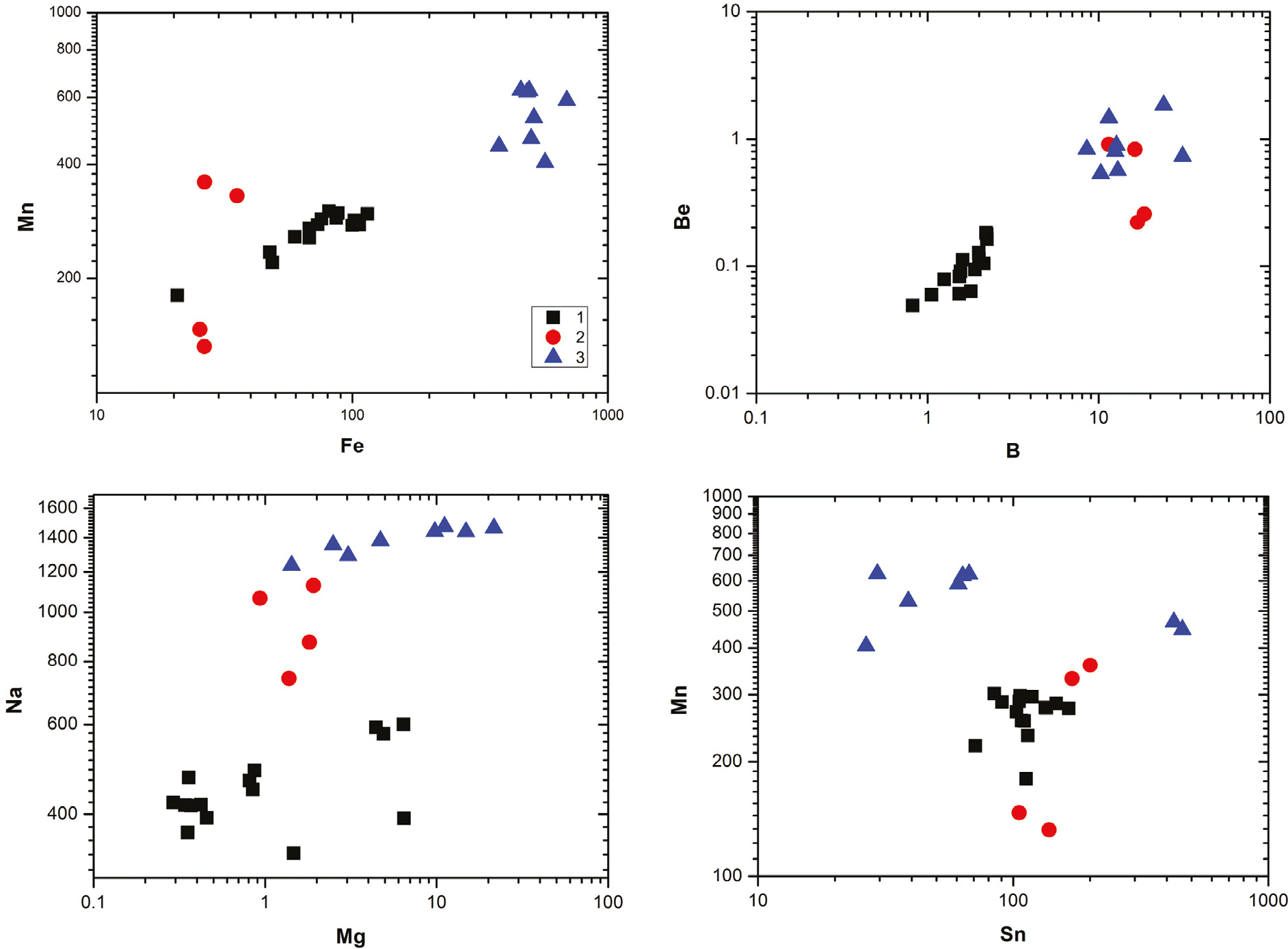 Fig. 8. Binary diagrams of Mn vs Fe, Be vs B, Na vs Mg, Mn vs Sn (ppm) in spodumene crystals of different generations. 1, 2 – late generations: spodumene from cavity in pegmatite (sample no. 1); 2 – spodumene from quartz core of pegmatite (sample no. 2); 3 – early generation spodumene of the main part of blocky pegmatite (sample no. 3).