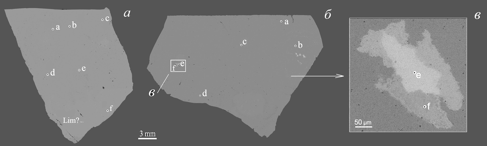 В препарате 50б розоватые участки а, c, d (рис. 6б) содержат 8.29, 7.44 и 7.72 мас. % F, в голубоватом участке «b» – 8.48 мас. % F с эмпирическиими формулами состава: a – Al1.98[SiO4]F0.79(OH)1.15; b – Al2.02[SiO4]F0.82(OH)1.24; c – Al2[SiO4]F0.71(OH)1.29; d – Al2[SiO4]F0.74(OH)1.21; e – Al2.16[SiO4]F1.18(OH)1.30; f – Al2.05[SiO4]F0.86(OH)1.29. Участок e выделяется немного повышенными количествами F и Al (рис. 6б, в), что предположительно, связано с микроблоком топаза другой ориентировки.