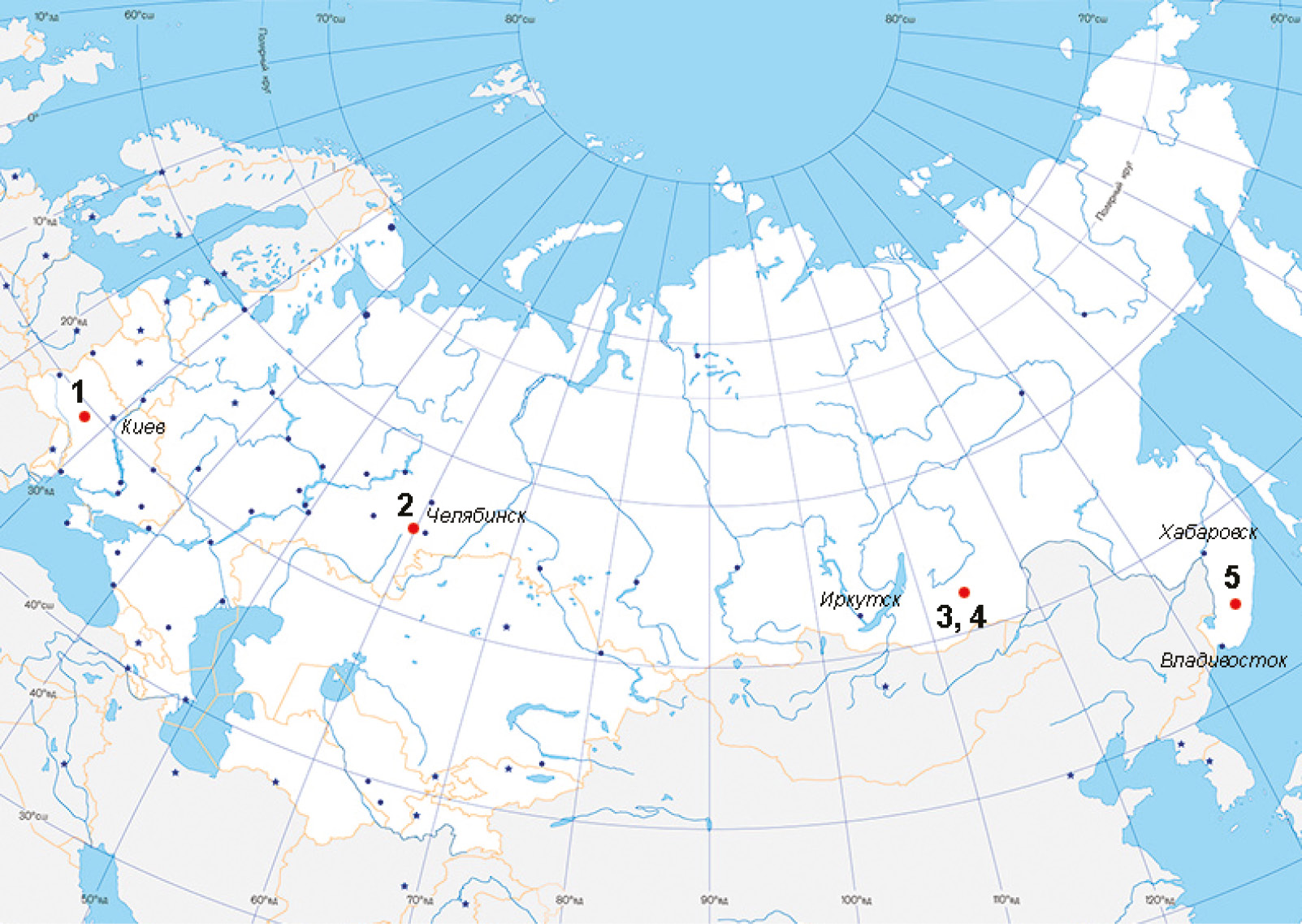 1 – Волынь; 2 – Урал, Ильменские горы; 3, 4 – Забайкалье; 5 – Приморье.