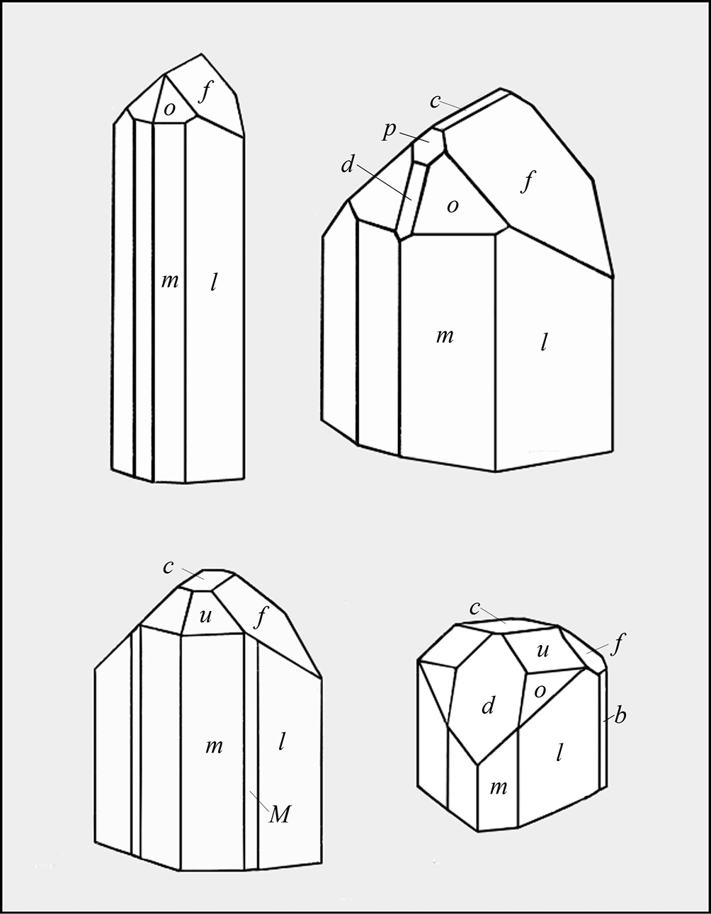 Рис. 2. Обычные формы исследованных кристаллов топаза (индексы форм описаны в тексте).