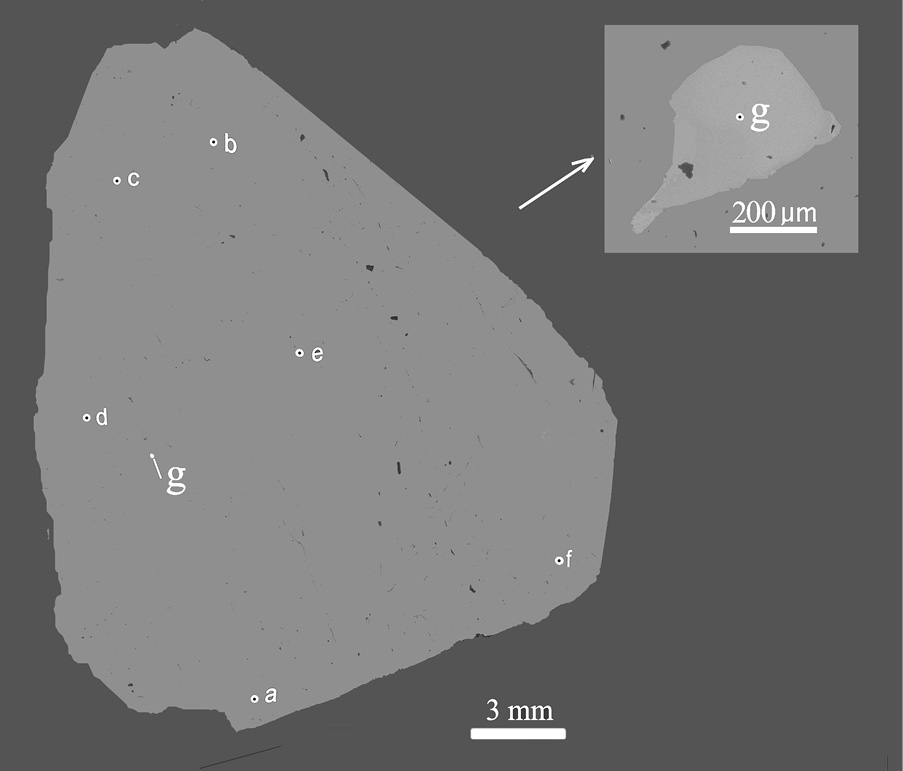 В этом топазе выявлено микровключение циркона с вариациями содержания HfO2 0.64–2.35 мас. % и эмпирическими формулами состава: на участках d – (Zr0.99Hf0.01)[SiO4] – в центре зерна; e – (Zr1.0Hf0.01)[SiO4] – на периферии его; f – (Zr0.97Hf0.02)[SiO4] – в участке «зоны обрамления».