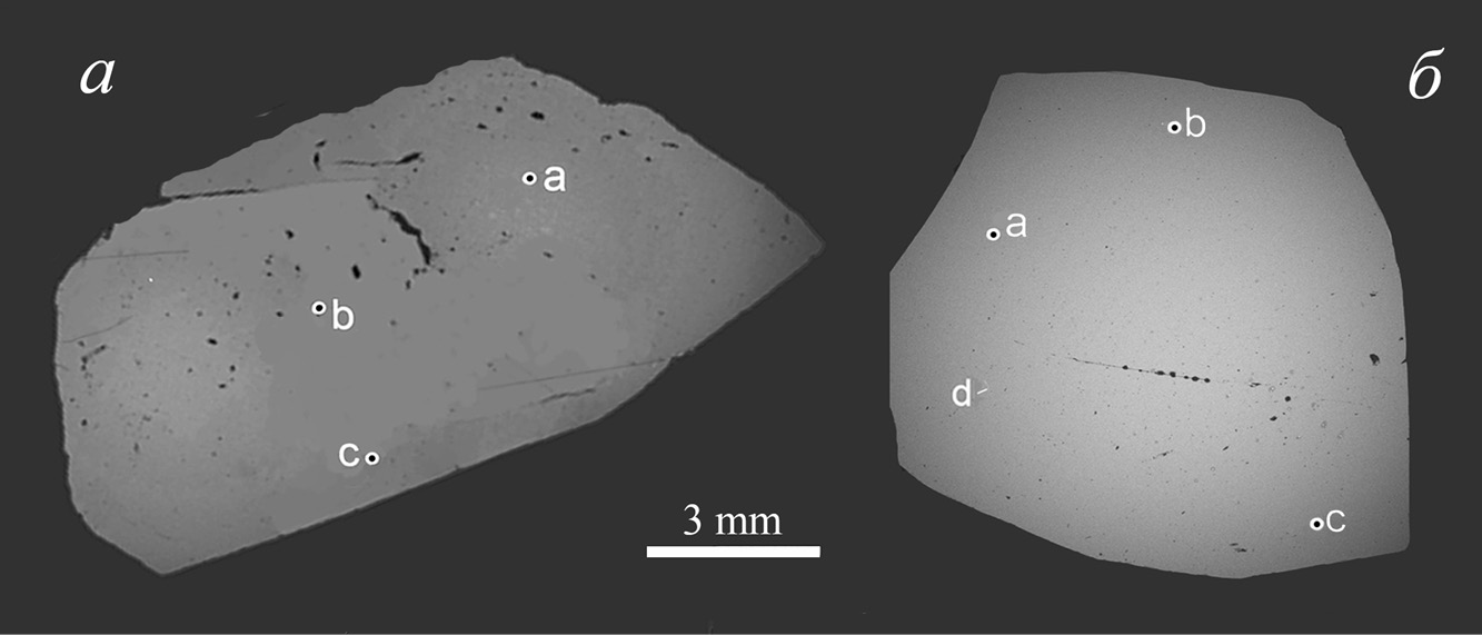 Fig. 10. BSE image of fragments of topaz crystals no. 141 (а) and no. 58 (б) from granite pegmatites of the Ilmeny State Reserve.