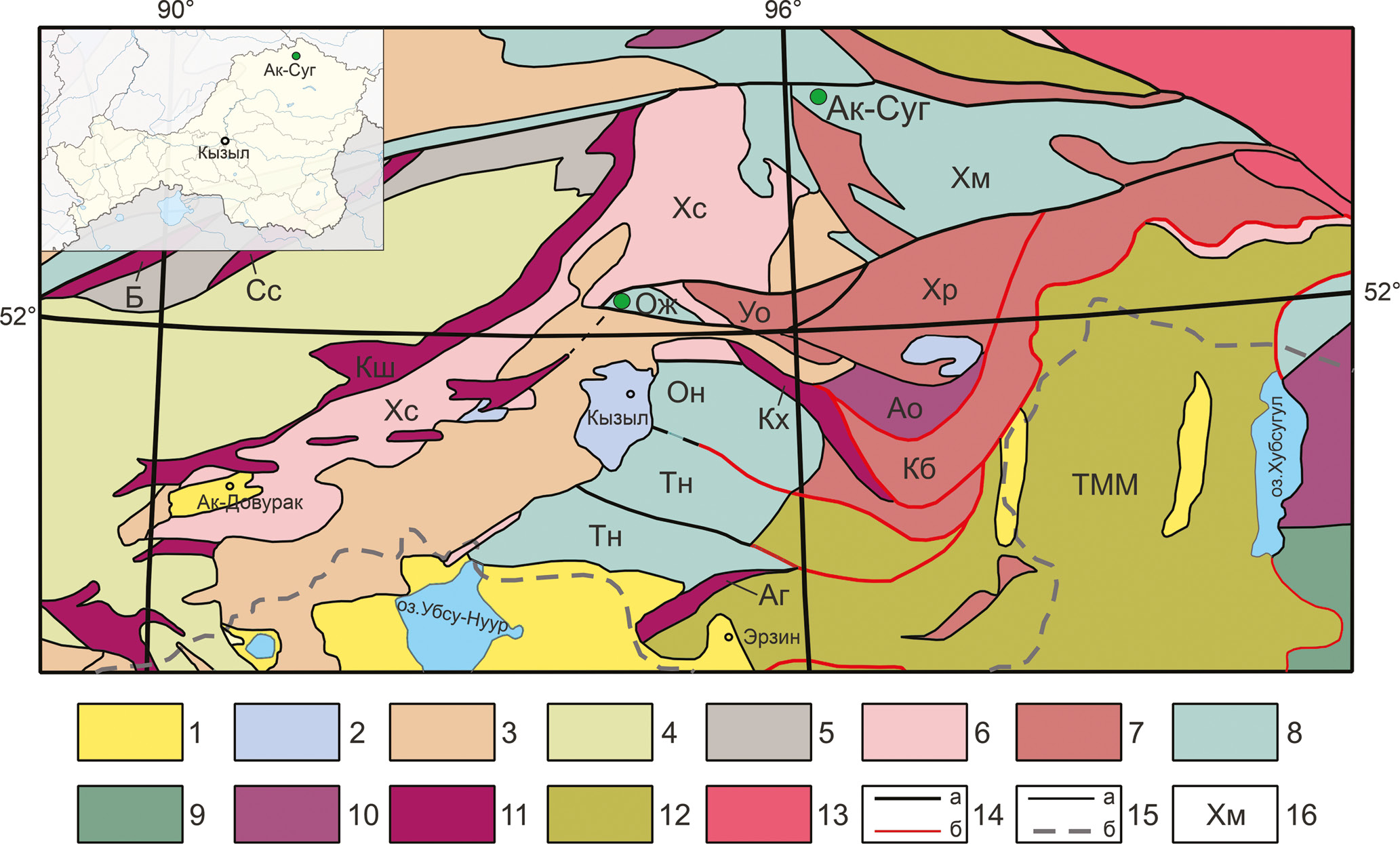 1 – Loose sediments of Cenozoic basins; 2 – terrigenous deposits of the Jurassic troughs; 3 – igneous and sedimentary associations of the Devonian rift troughs; 4 – Cambrian-Silurian turbidites of the continental margin; 5 – mostly turbidite accretionary prisms; 6–10 – structural-compositional complexes of the Vendian-Early Cambrian island arc system: 6 – fore-arc terrigenous; 7 – back-arc volcanic and terrigenous-volcanic; 8 – island-arc sedimentary-volcanic and volcano-plutonic; 9 – undifferentiated island arc; 10 – fore-arc and back-arc ophiolite allochthons; 11 – metamorphic complexes; 12 – Precambrian microcontinents; 13 – Siberian craton; 14 – main post-accretion faults (a) and thrusts (б); 15 – boundaries of structural zones (a) and state boundary (б); 16 – names of lithotectonic units of the Tannuola-Khamsara island-arc system: fore-arc Sayan-Tuva group of lithotectonic zones: Ksh – Kurtushibinskaya; B – Borus; Ss – North Sayan and Khs – Khemchik-Systyghem; island-arc Tannuola-Khamsara group of zones: Tn – Tannuola Subzone; On – Ondum Subzone; Ож – Ozhu Zone; Хм– Khamsara Zone; back-arc East Tuva group of zones: Аг – Agardag; Кх – Kaakhem; Уо – Ulugoi; Хр – Kharal; Кб – Karabeldyr; Ao – Agoi metamorphic terrane; TMM – Tuva-Mongolian microcontinent.