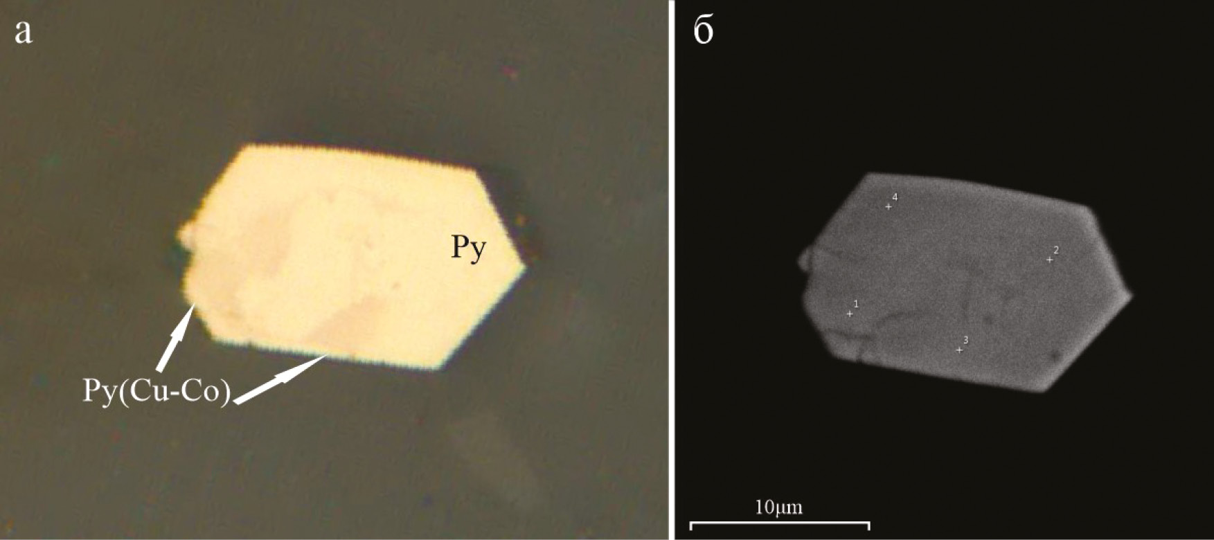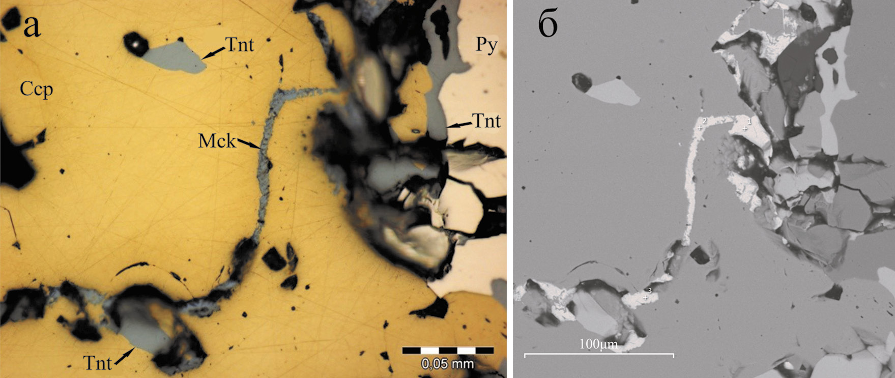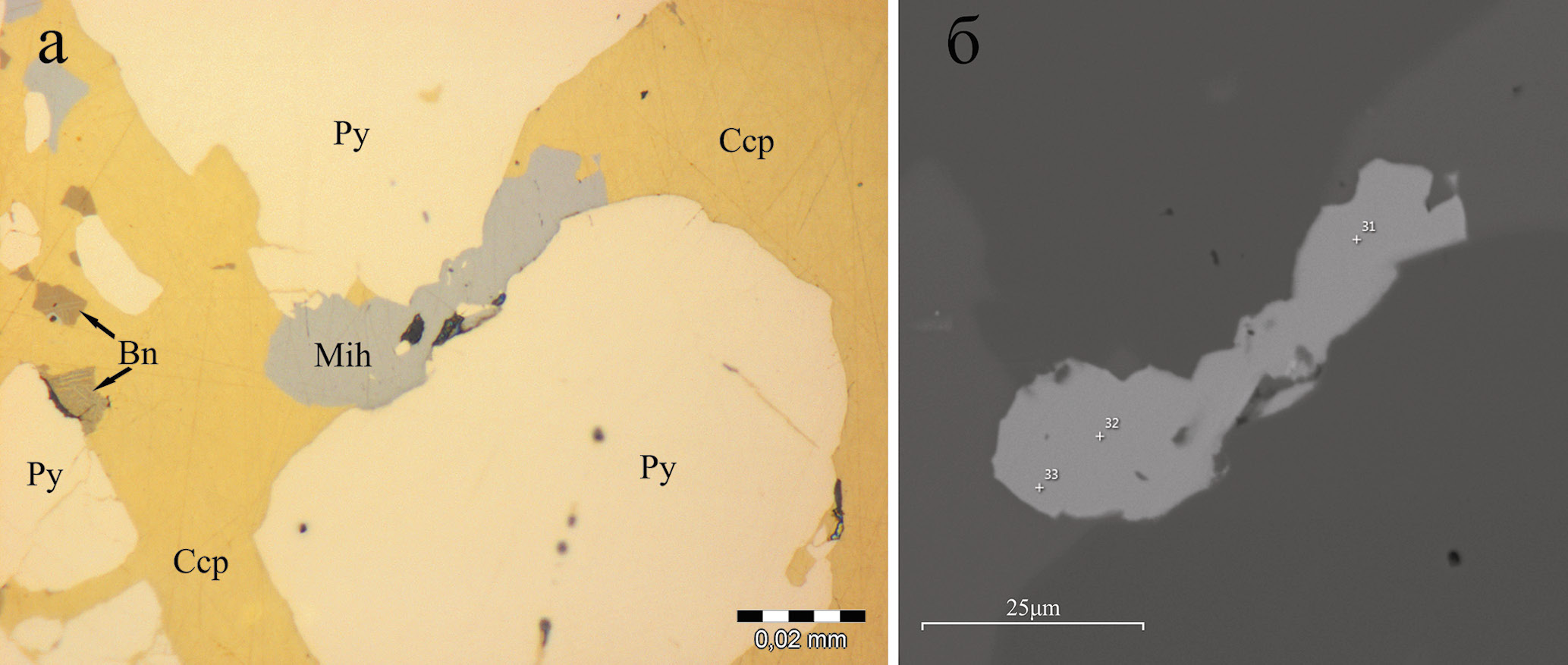 Fig. 3. Miharaite grain (Mih) at the boundary of pyrite (Py) and chalcopyrite (Ccp) with bornite (Bn) inclusions. Sample 10-5/275.0. Hereinafter: a – reflected light; б – BSE image.