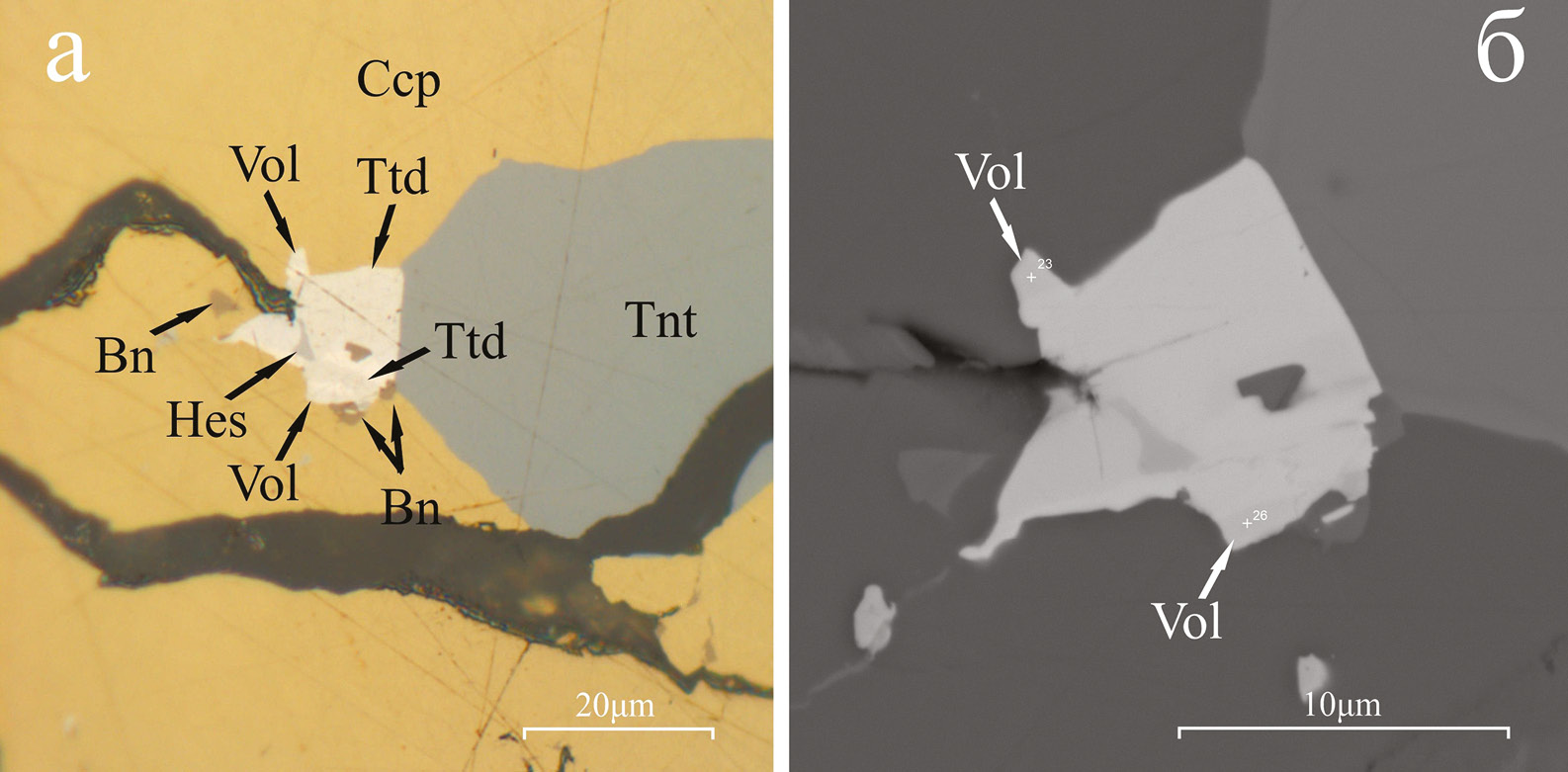 Рис. 4. Волынскит (Vol) в ассоциации с тетрадимитом (Ttd), гесситом (Hes) и борнитом (Bn) на границе с халькопиритом (Ccp) и теннантитом (Tnt). Обр. 6-1/973.1.