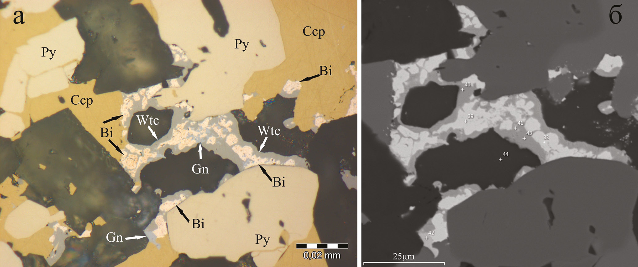 Виттихенит Cu3BiS3 и самородный висмут Bi срастаются с Se- и Bi-содержащим галенитом и обнаружены среди пирит-халькопиритовых агрегатов (рис. 5). В составе сульфидных сростков часто присутствуют включения и каймы виттихенита размером до 5–10 мкм и мелкие (до 5 мкм) зерна галенита. Самородный висмут образует линзовидные, округлые или ксеноморфные агрегаты в окружении виттихенита и галенита. Размеры зерен самородного висмута варьируют от 1–2 до 10 мкм. Реже его зерна достигают размера 0.02 × 0.04 мм. Состав виттихенита близок к теоретическому, но характеризуется небольшими примесями Ag и Se, типичными для этого минерала (Чвилева и др., 1988). Присутствие низких концентраций Fe и Cu в составе самородного висмута можно объяснить их вхождением (Fe в виде примеси до 1 мас. %) в айкинит (табл. 2).