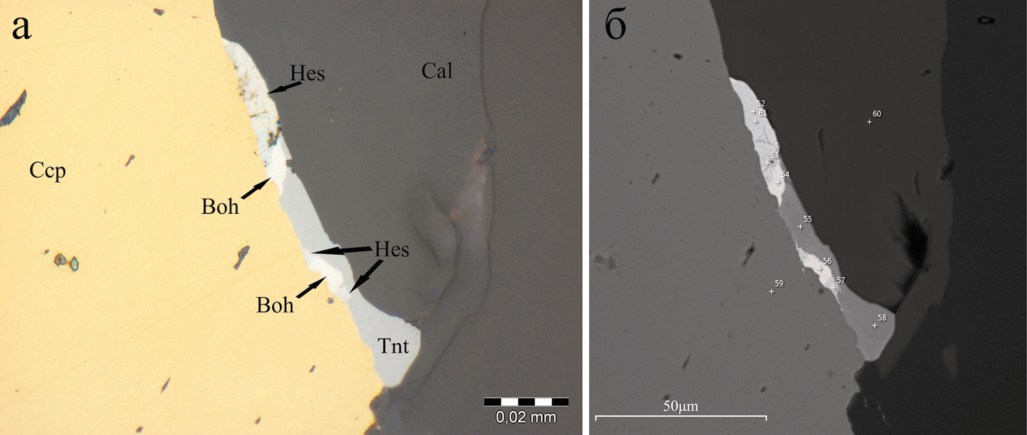 Рис. 6. Зерна богдановичита (Boh) на контакте с гесситом (Hes) и теннантитом (Tnt) в составе кальцитового (Cal) прожилка c халькопиритом (Ccp). Обр. 11-9/268.0.