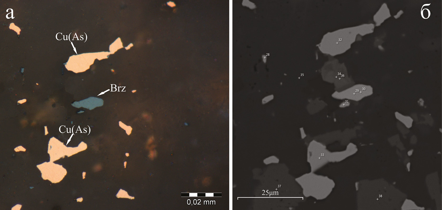 Рис. 7. Зерна берцелианита (Brz) в ассоциации с мышьяксодержащей гипергенной самородной медью (Cu(As)). Обр. 5-4/263.1.