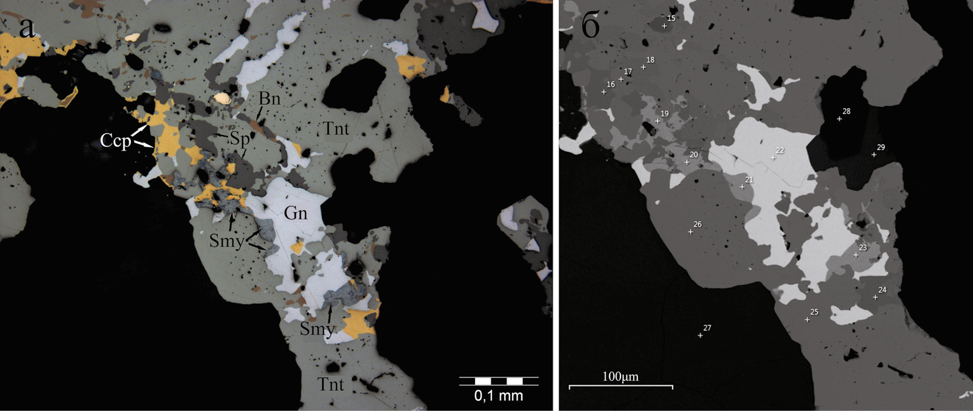 Fig. 10. Stromeyerite (Smy) in assemblage with sulfides (Ccp – chalcopyrite; Gn – galena; Sp – sphalerite; Bn – bornite) and fahlore (Tnt – tennantite). Sample 3g-1/292.0.